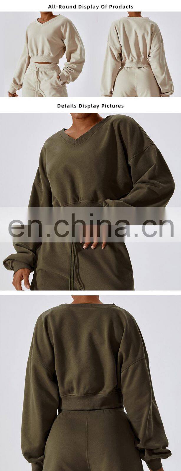 V Neck Fleece Oversized Tops Women Pullover Wholesale Cropped Hoodies Sweatshirts 50cotton 22polyester