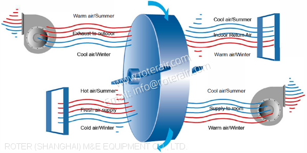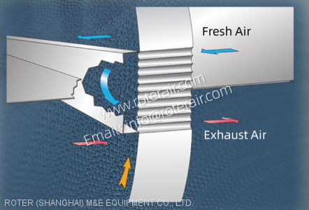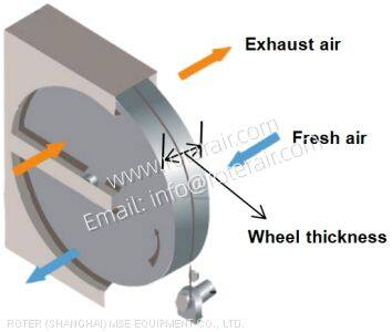 The heat recovery wheel continuously rotates at 10rpm and the wheel acts as a heat storage media. When the fresh air passes through a semicircle part of the HRW, the exhaust air passes through the other semicircle part in the opposite direction at the same time. In this way, fresh air and exhaust air alternately pass through the wheel in opposite directions, and the exhaust air releases energy into the heat or cold storage media, and the fresh air will bring the energy from the heat storage media into room.