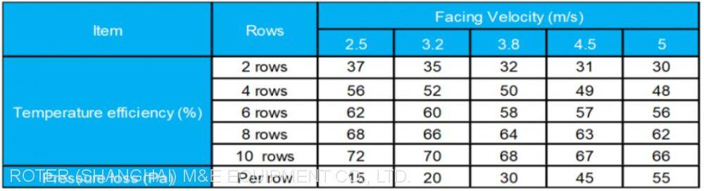 The heat pipe heat exchangers’ temperature efficiency is generally from 50% to 70%. Facing velocity and the number of rows as the main factors affecting the temperature efficiency, whose influence to efficiency of the heat exchanger can be checked from below table and diagram