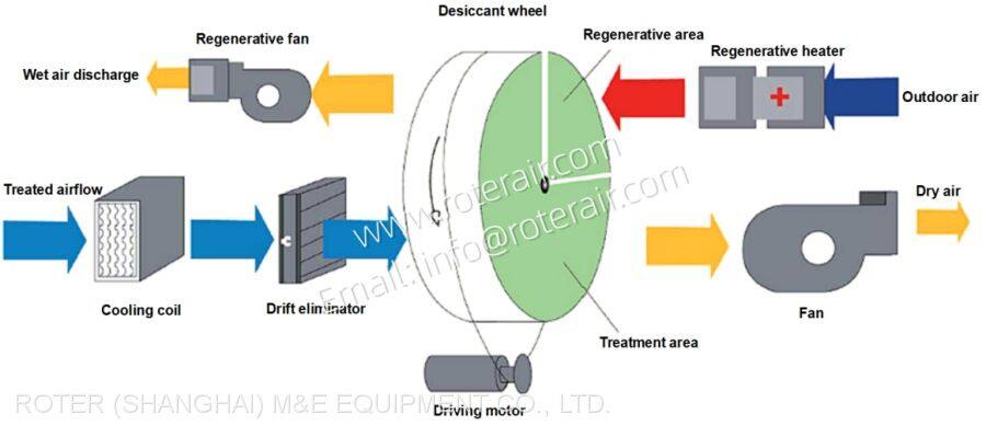 At the same time, the rotary desiccant wheel keeps rotating at a slow speed (12~24rpm), when it rotates to the regenerative area, the high-temperature regenerative airflow will remove the moisture from the wheel and make the desiccant wheel to be a dry wheel again. In this way, the rotary desiccant wheel continuously absorbs moisture from the wet air, then regenerated and dried, to achieve continuous dehumidification and generate stable dry air.