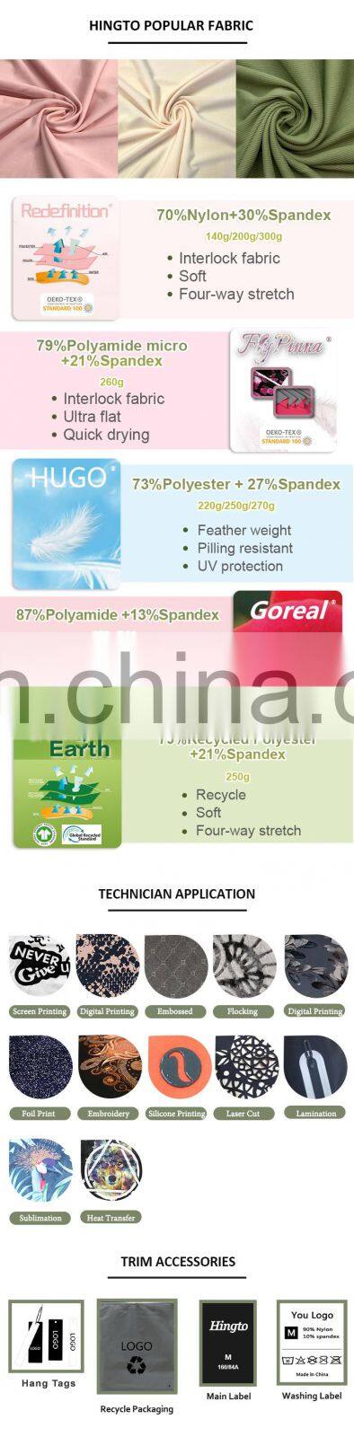 Fabric | 1. 76% Recycle Nylon , 24% Spandex( High Stretch, Anti-pilling) 2. 62% Recycle Nylon , 38% Spandex( High Stretch, Anti-pilling) 3. 75% Polyester, 25% Spandex( buttery soft) Can be Customized | ||||||