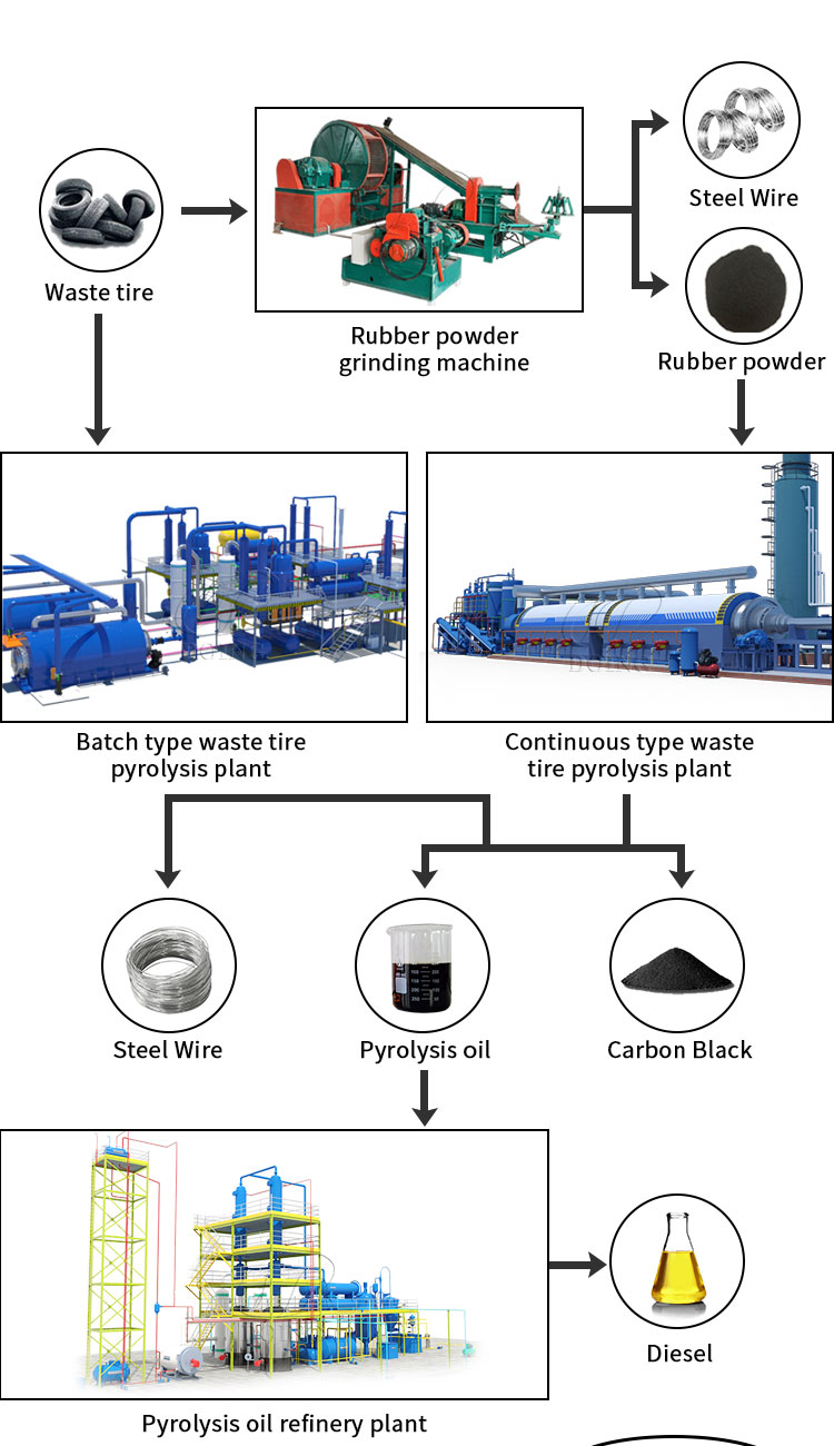 - Batch/continuous Waste Rubber Tire/car Tyres to Fuel Oil Pyrolysis Plant