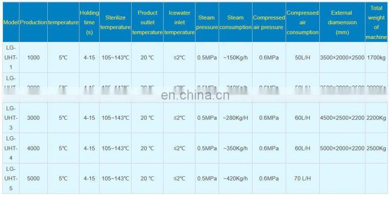 5℃→65℃(homogenizer)→137℃(3-5S)→20℃-25℃. This UHT system adopts ultra high heat treatment to sterilize the liquid dairy products, tea drink and juice for the the aseptic filling production; the sterilize temperature is 137℃ holding for 3~5S,by this procedure to remain the nature nutrition and flavor of the milk and juice;
