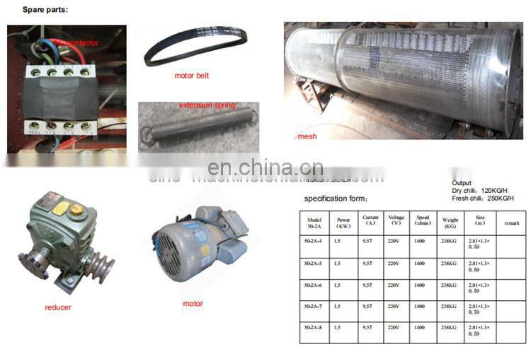 50-2A | Fresh chili 250kg/h Dry chili 120kg/h | 3KW | 220V | 1400RPM | 238kg | Carbon steel |