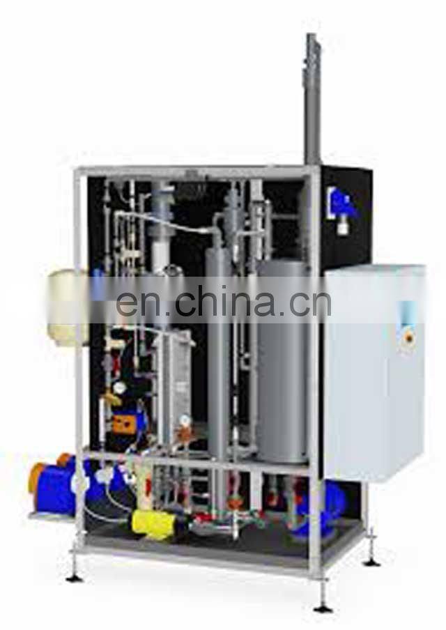 High concentration sodium hypochlorite generator uses membrane to electrolysis 25%-30% brine to produce chlorine gas which is sent into the reaction tower for mix reaction with sodium hydroxide, then got the final product of l2% sodium hypochlorite solution;The system consists of: salt treatment unit, ultra-pure water system, control cabinet, electrolytic unit, reaction tower, sodium hydroxide recycled unit etc.
