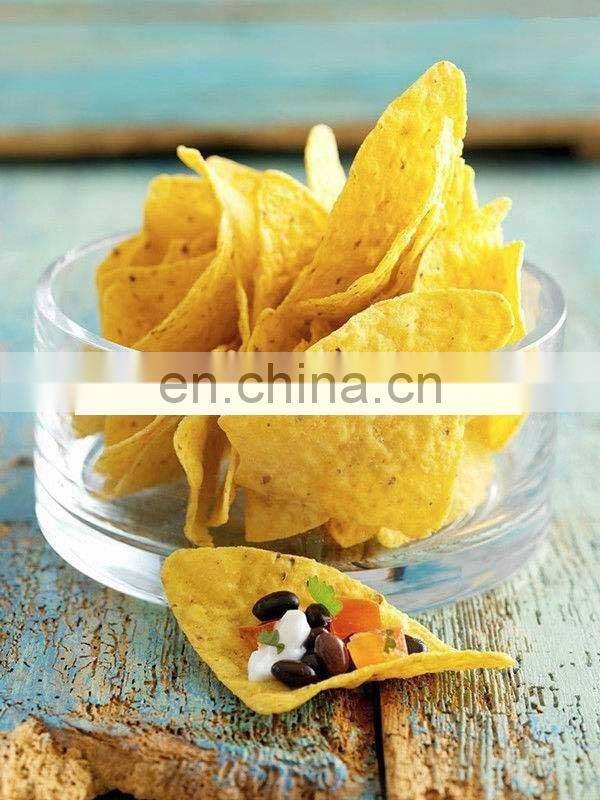 The tortilla chips are kinds of snacks made from corn powder, which are cut and then fried. The main raw materials are corn powder, vegetable oil, salt and water. Although usually made of yellow corn(as pictured), they can also be made of white, or red corn. After frying and flavoring, we get very crunchy triangle or other shapes chips which are popular with both children and adult.
