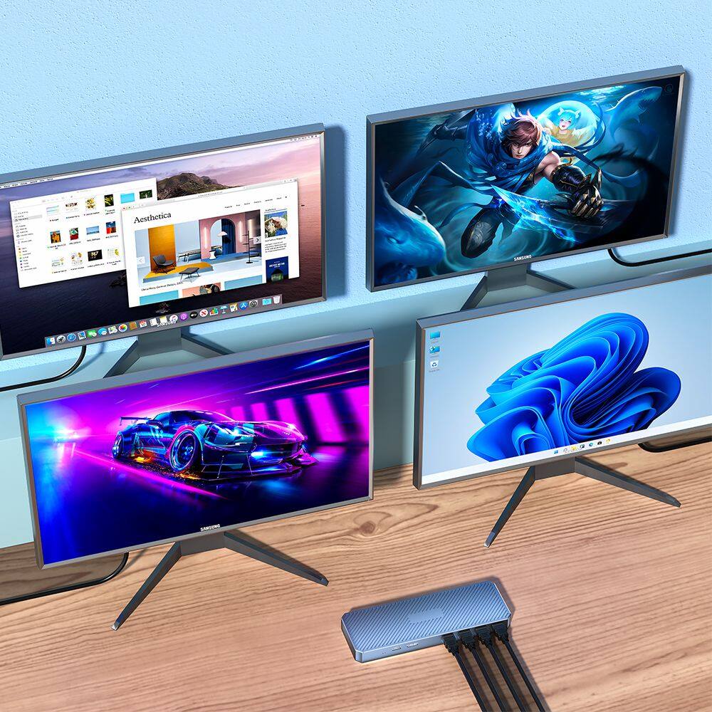 2、Enhanced Visual Productivity: This docking station supports up to four external displays via two HDMI and two DisplayPort (DP) ports, accommodating various display setups. It can handle quad 4K @ 60 Hz or single 8K @ 60 Hz with DSC enabled on Windows laptops and dual 6K @ 60 Hz on select MacBook models.