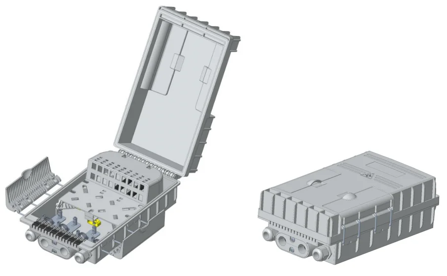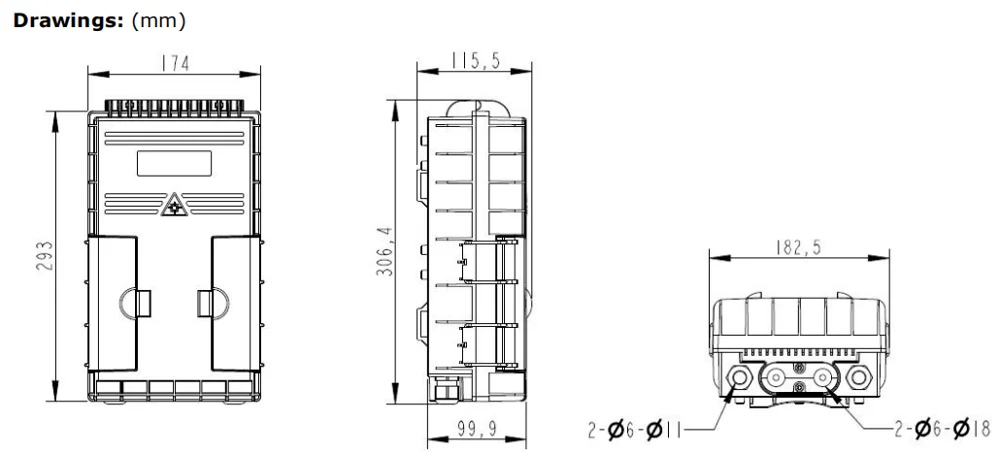 BP034 | Max. 18FO | 182.5X306.4X115.5 (mm) | 16 pcs SC simplex | 1pc 1:16 steel tube type splitter | 2 PG gland + 1 oval + 16 drop cable port |