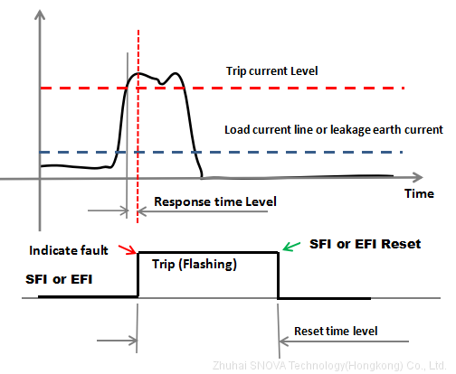 When the Earth line occurs fault current, and the fault current is above than the trip current level,and fault current is running a delay time above that “response time” level. Then indicator will be indicating fault. After a “reset time” EFI will be reset automatically.