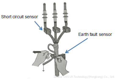 About Earth fault sensor need to round the 3 phases cable conductor together (if have phase N,then directly mounted on phase N cable). And tighten it with belt, and the cable grounding line must insert back the sensor, and tighten it avoid the loose and fall down. As below: