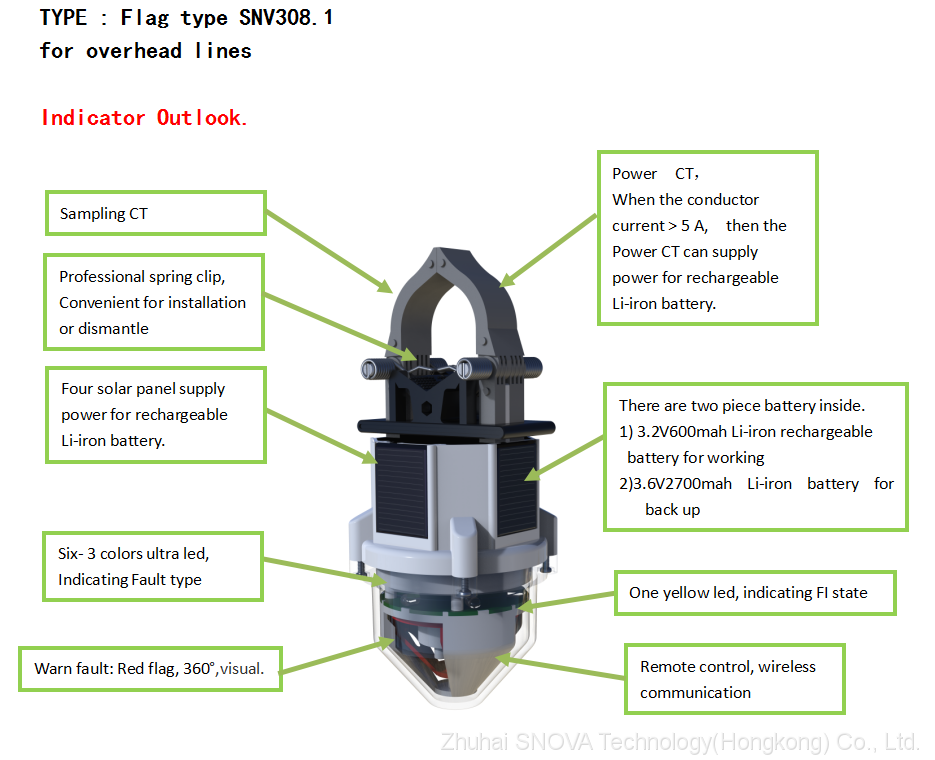SNV308.1 series overhead type Fault Indicator system is based on the Sensor that through CT get the (6KV-70KV) line’s current signal, through smart computer chip(IC) by program calculating, Analysis ,judge the short circuit or ground fault. When Sensor detect the fault happen, then the Fault indicator warn the manager through turn red flag, and shine 3 color ultra-led. It is good for power managing user to find the fault happen reason and place, then fast solve the problem and make the power restore. *SNV308.1 Fault Indicator with the aid of the remote control PDA(SNV306.1), User can read, reset the indicator’s setting parameter, and can read the online real time current etc