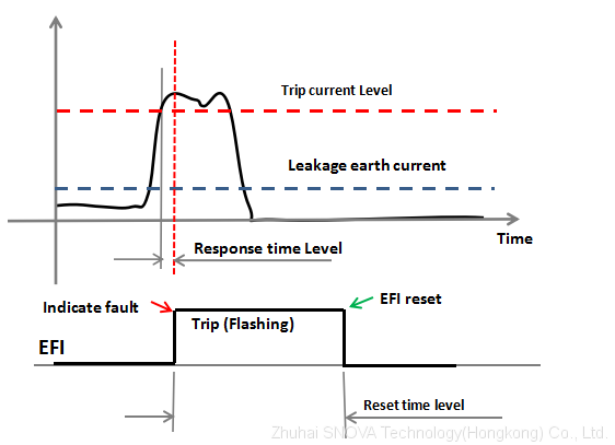 When the Earth line occurs fault current, and the fault current is above than the trip current level,and fault current is running a delay time above that “response time” level. Then indicator will be indicating fault. After a “reset time” EFI will be reset automatically.