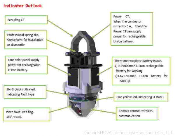 1) short circuit permanent fault indicating: Six 3-color led will shine red color, and four times, every 2 second,And turn to red flag at same time。