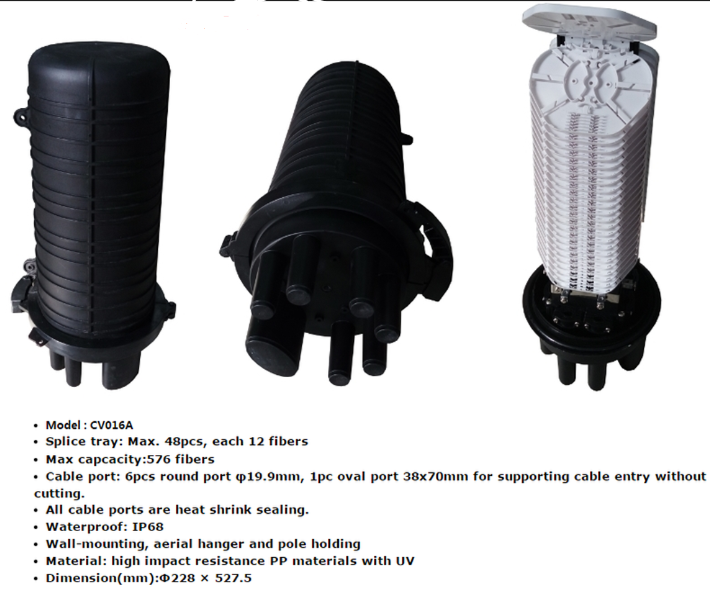 CV016A | 48 trays, each 12 fibers | 576 fibers | Φ267 × 527.5 |