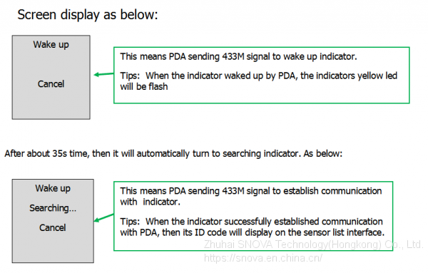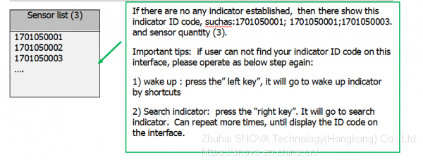 *Sensor select. It is for wake up indicator sensor. and searching indicator sensor. Then choose indicator. Note: “wake up” means to open indicator sensor 433M port, make it into communication state. “search indicator” means make indicator establish communication. Only when searched indicator’s ID number, then user can operate this indicator.