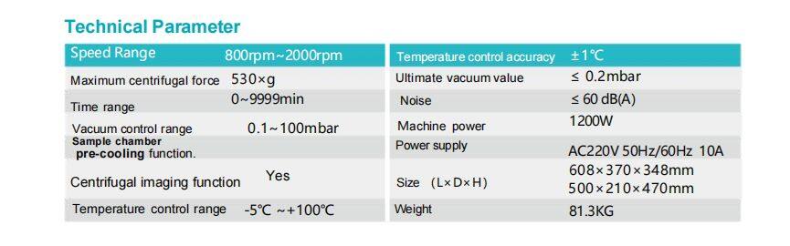 Fully automatic vacuum control system inside ,with a control range of 0. 1~100mbar and control precision of +0.1mbarAutomatically releases vacuum pressure through an impoted pressure relief valve, making operation simple and safelt also features an automatic switch function.Two-stage temperature control design to ensure sample safety and protection.Four sets of program shortcut keys and 30 sets of user-defined programs.Centrifugal imaging function enables continuous observation of sample concentration progress