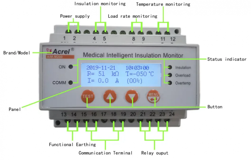 The AIM-M200 monitors the insulation resistance of medical IT system, At the same time, the load current and temperature of the IT