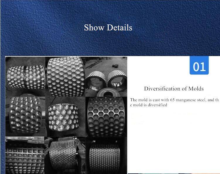 Hydraulic type has larger pressure, even some uneasy shaping materials, such as dry powder, fertilizer, salt, etc, can also press in good shape, the pressure can be adjusted according to different raw material.