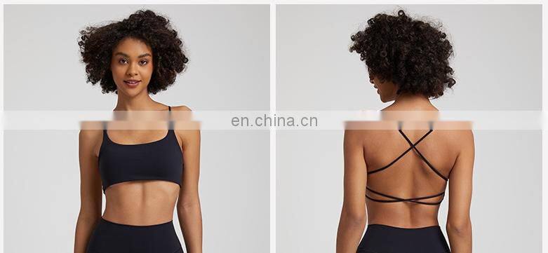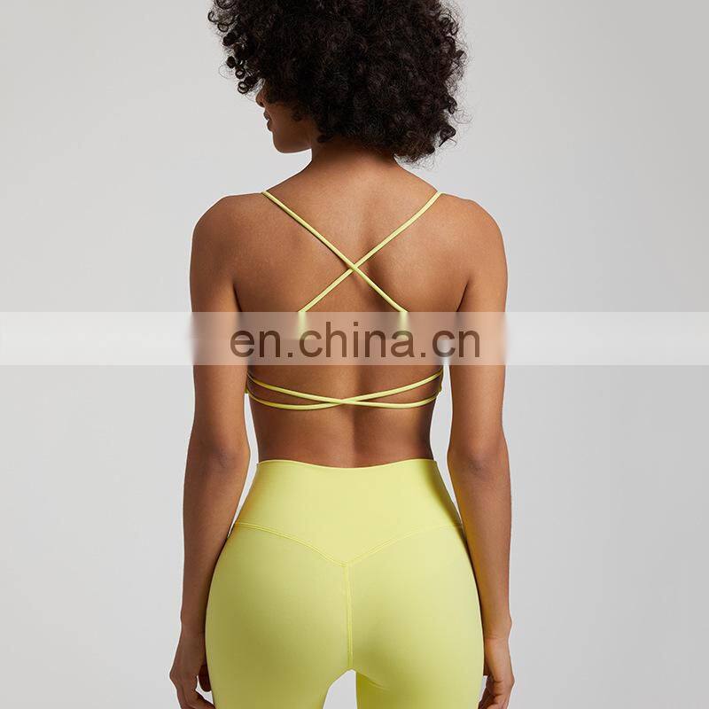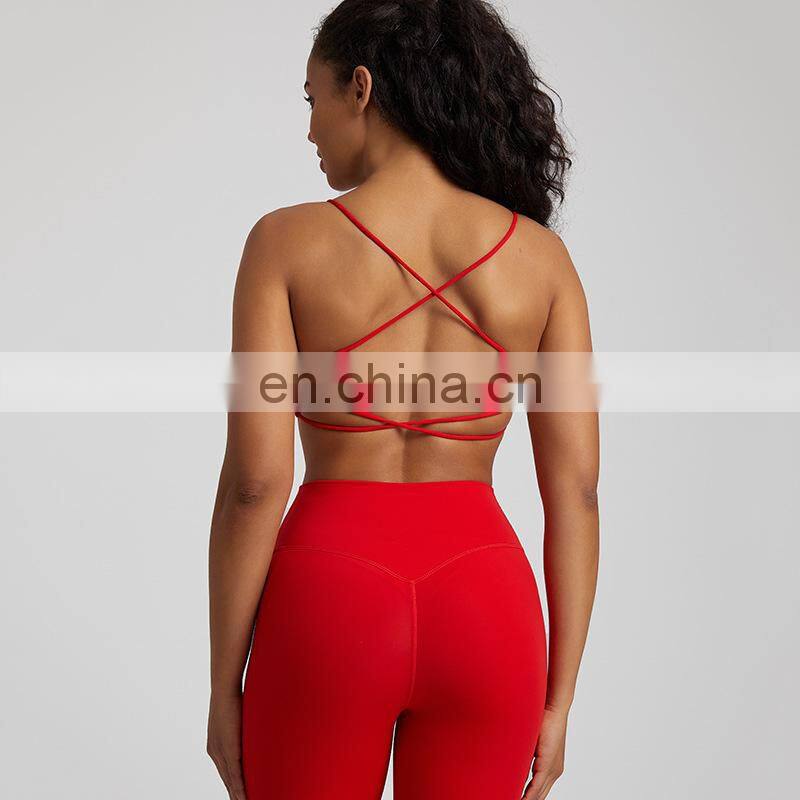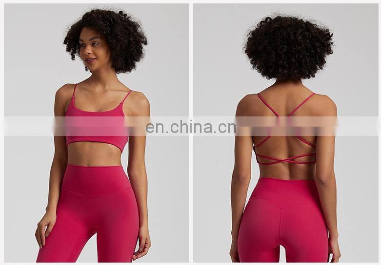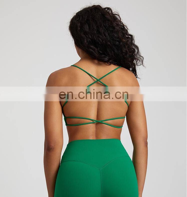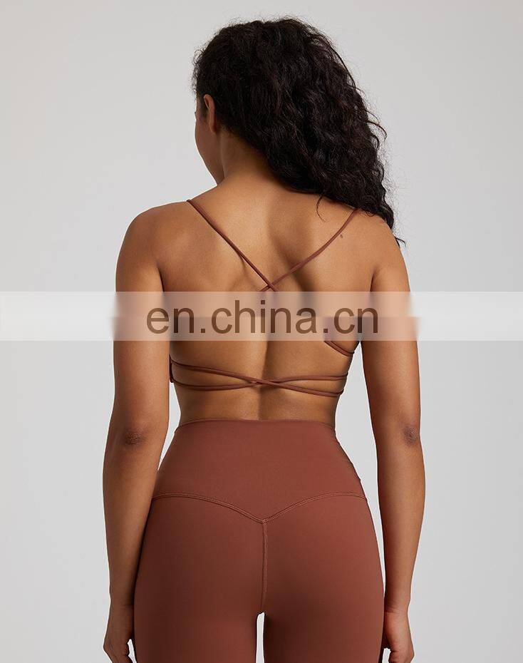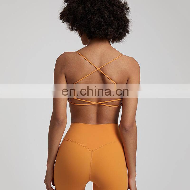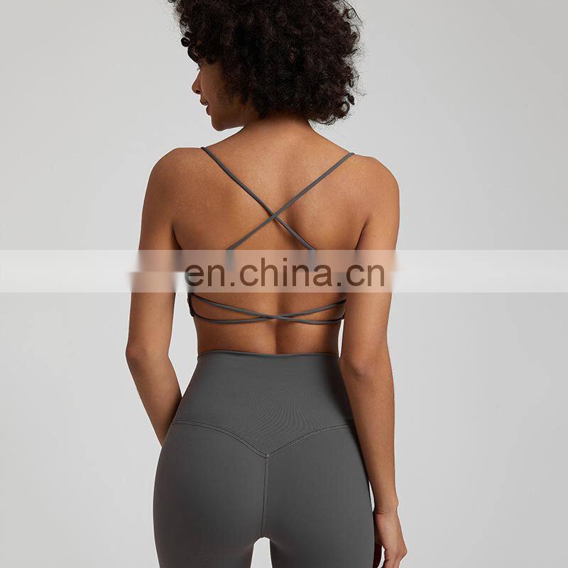 Summer New Thin Straps Sexy Padded Cross Back Open Back Sports Gym Fitness Wear Workout Soft Nude Feeling Women Yoga Bra Top