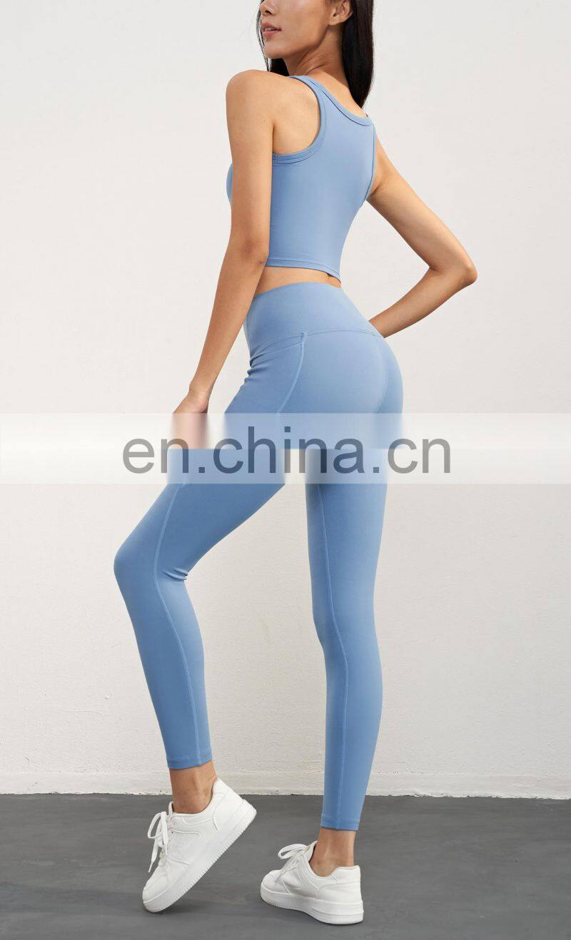 Wholesale Nude Breathable Sleeveless Crop Tank Top Loose Casual Elastic Pocket 2 Piece Sports Gym Yoga Set Women Fitness Wear