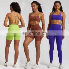 Wholesale Women Soft Breathable High Waist V Back Peach Hip Sports Leggings Shorts Thin Straps Bra Top 2 / 3 Piece Yoga Suit Set