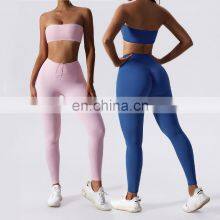 New Women Sexy Workout Strapless Bandeau Tube Top Bra High Waist Scrunch Butt Lift Leggings 2 Piece Fitness Gym Yoga Suit Set