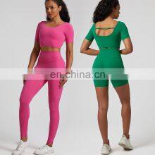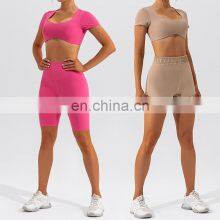 Wholesale Built In Bra Shorts Sleeve Crop Top V Back High Waist Shorts Leggings 2/3 Pcs Sports Women Gym Yoga Suit Set Outfit