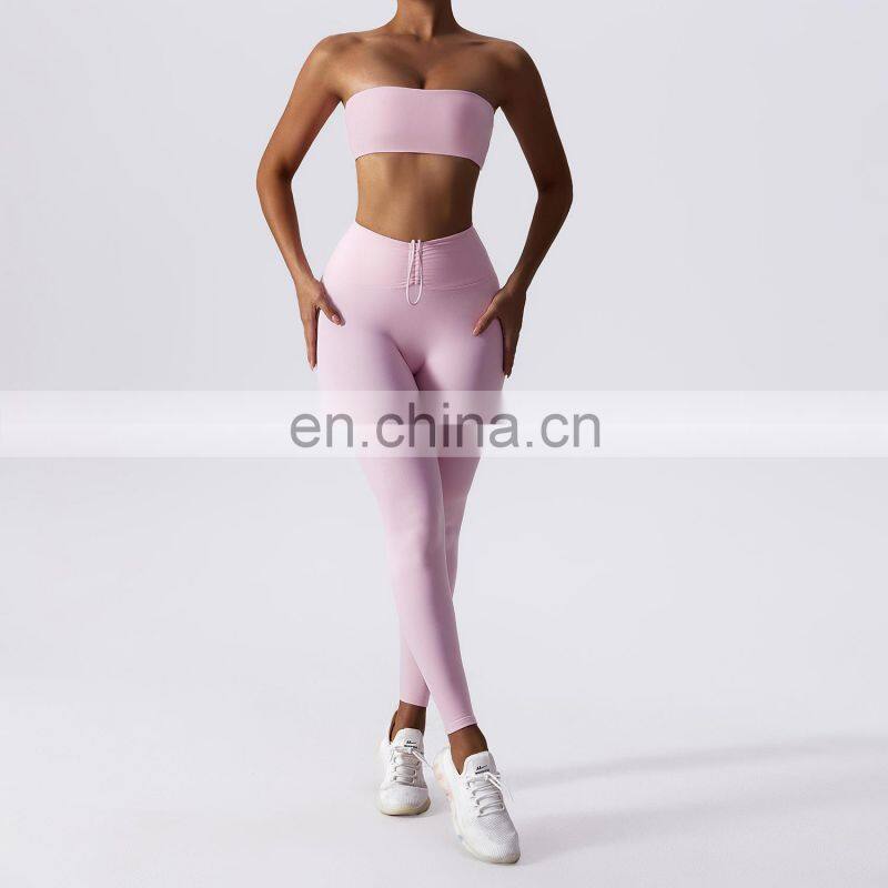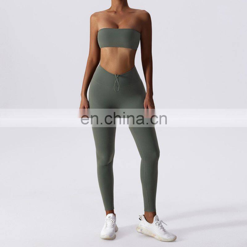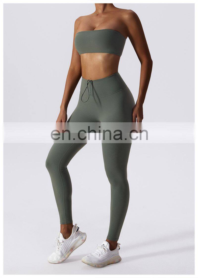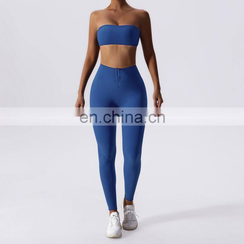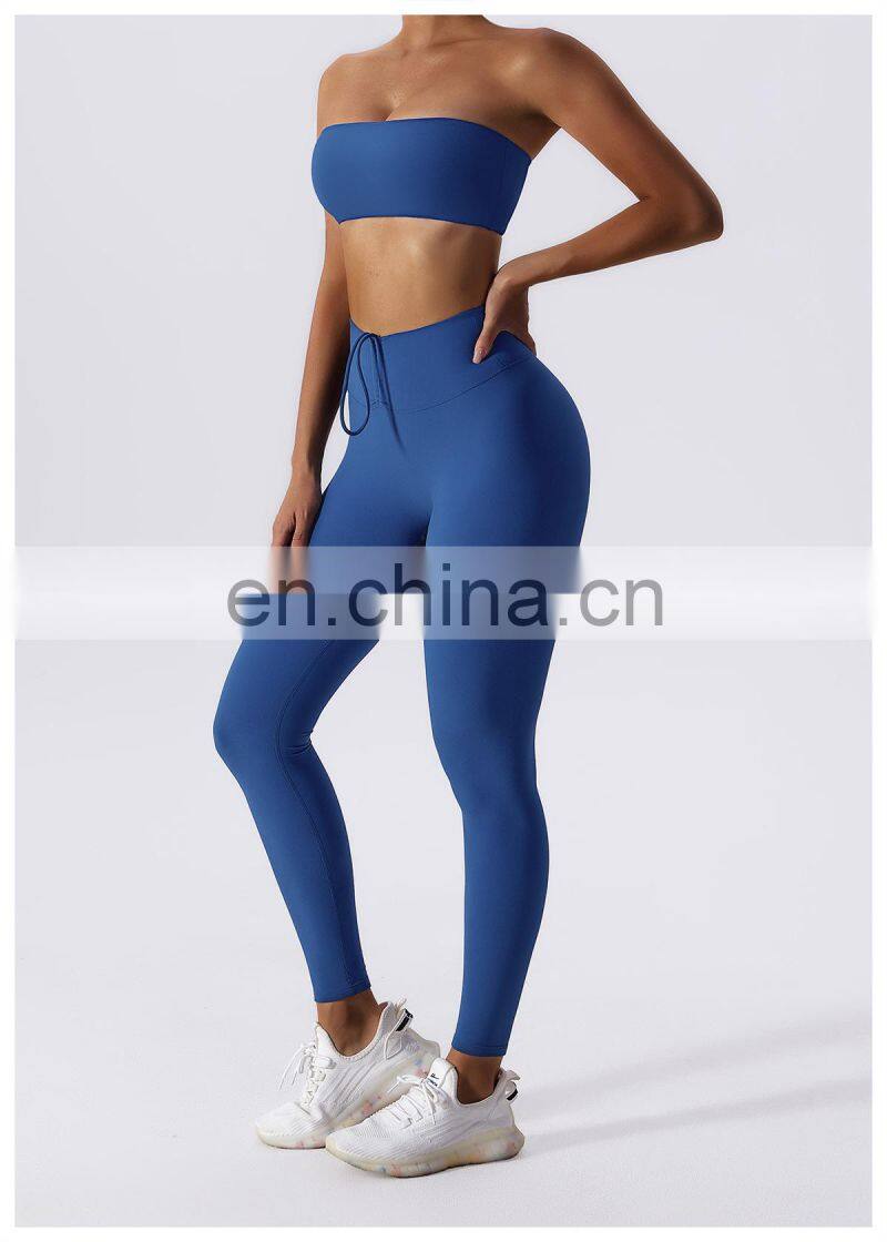 Home > Products > Gym Fitness Sets > New Women Sexy Workout Strapless Bandeau Tube Top Bra High Waist Scrunch Butt Lift Leggings 2 Piece Fitness Gym Yoga Suit Set