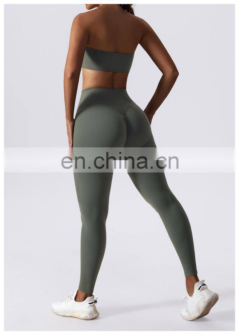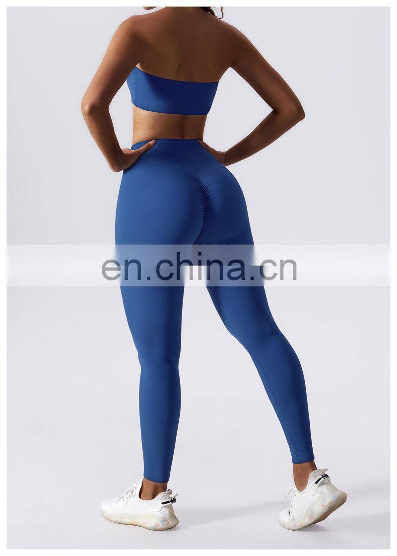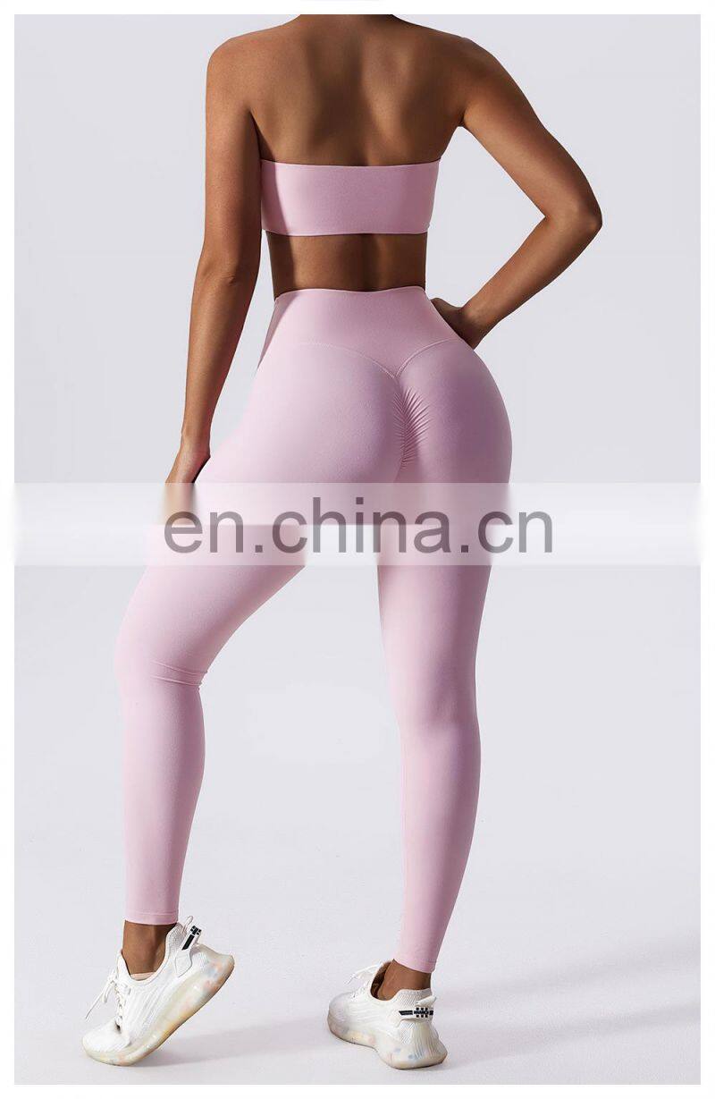 New Women Sexy Workout Strapless Bandeau Tube Top Bra High Waist Scrunch Butt Lift Leggings 2 Piece Fitness Gym Yoga Suit Set