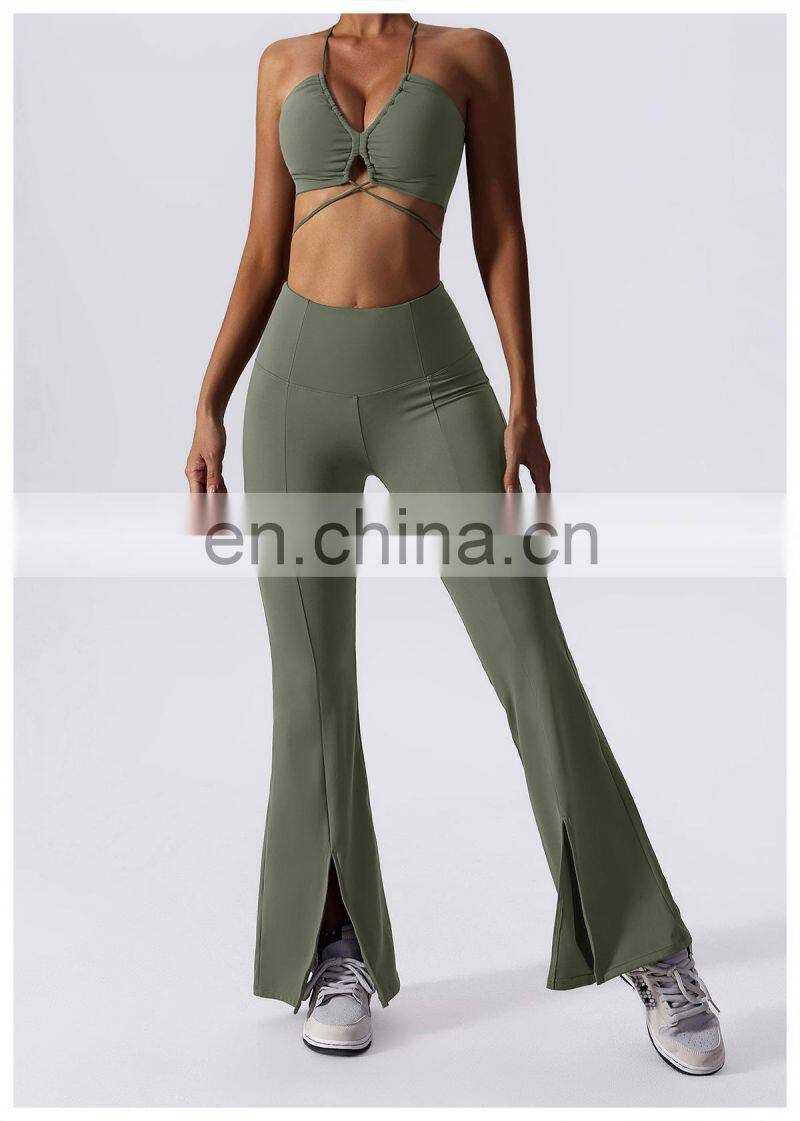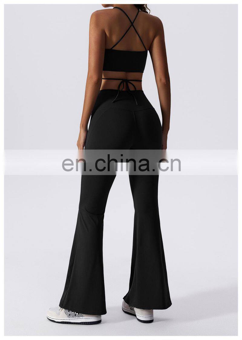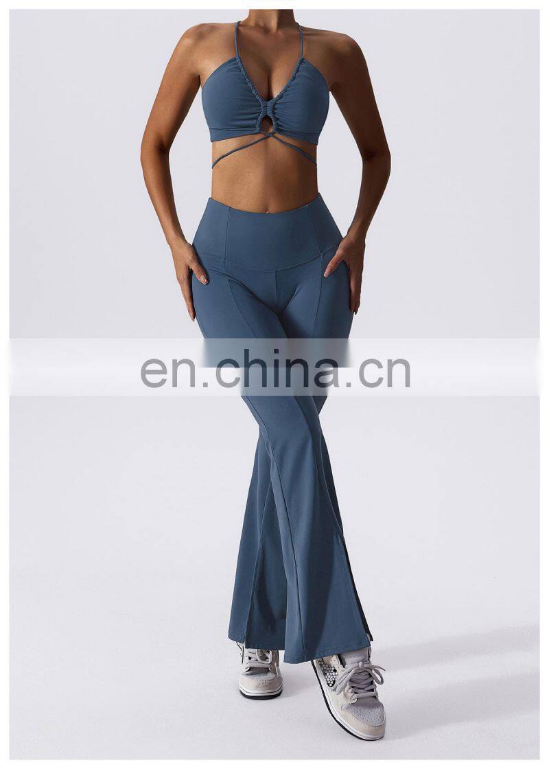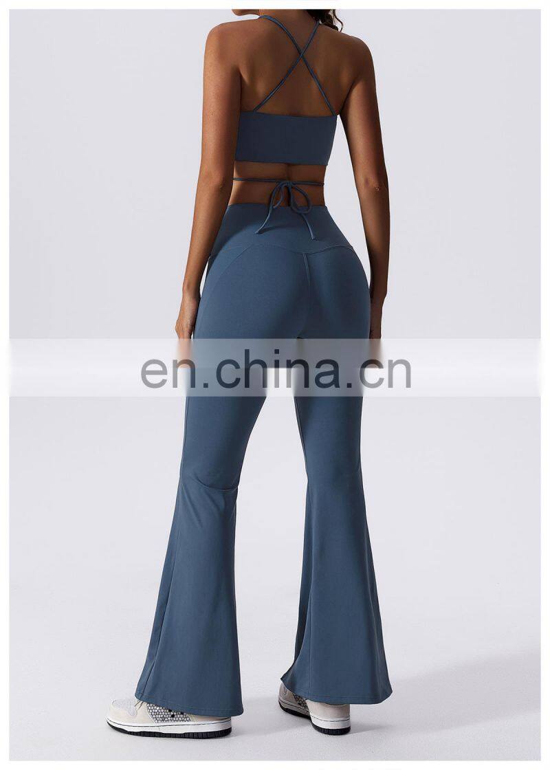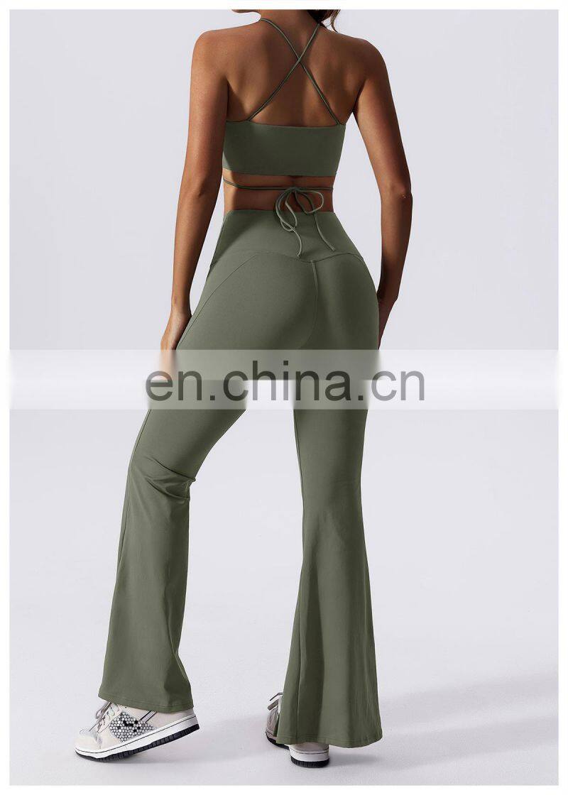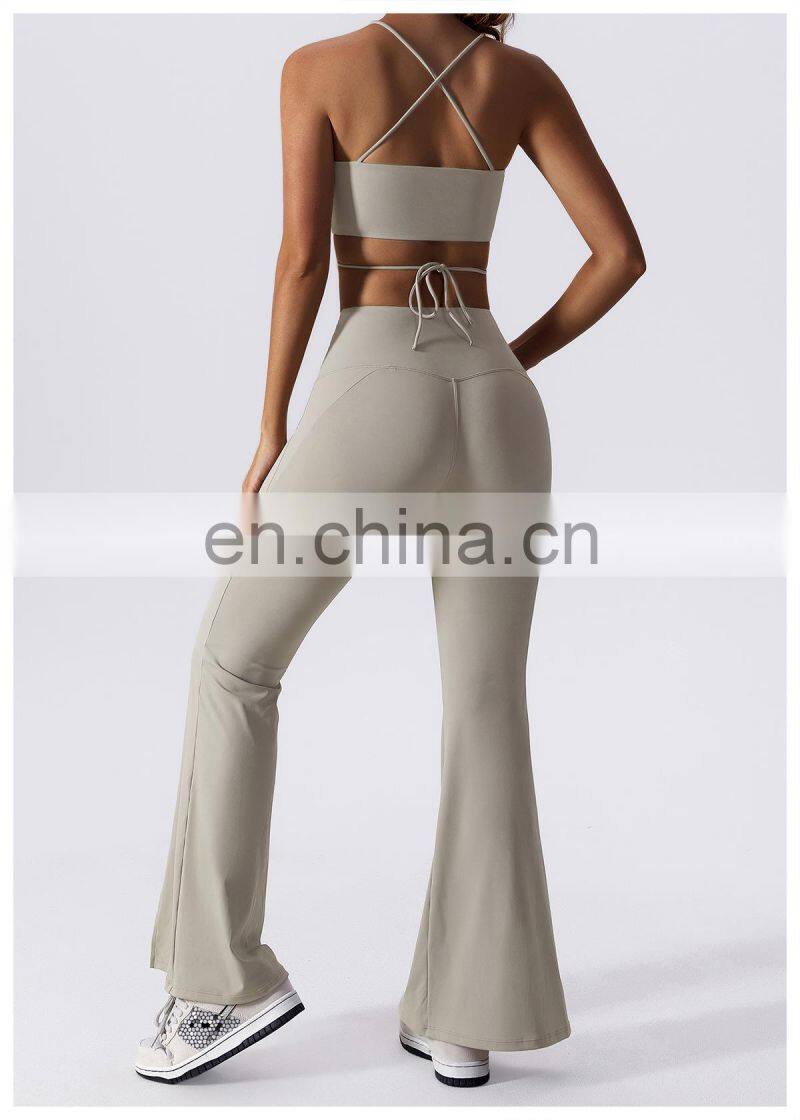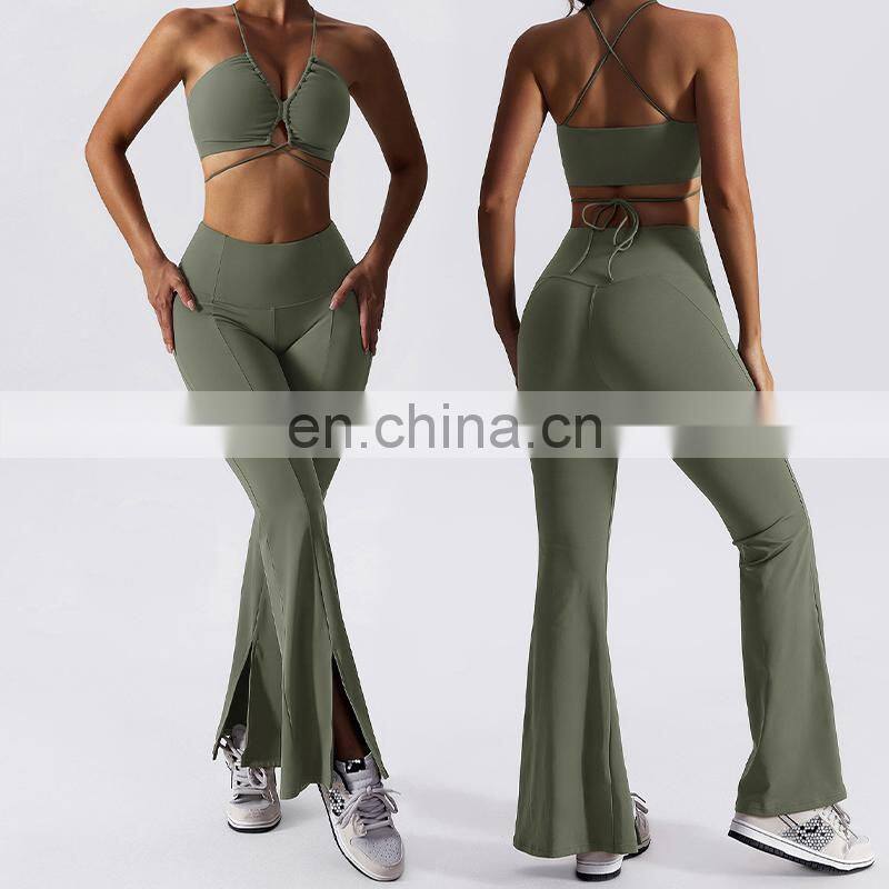 Home > Products > Gym Fitness Sets > New 2023 Sportswear Workout Sets 3 Piece Strappy Bra High Waist Flared Leggings Gym Fitness Sets Women Training Wear Clothing