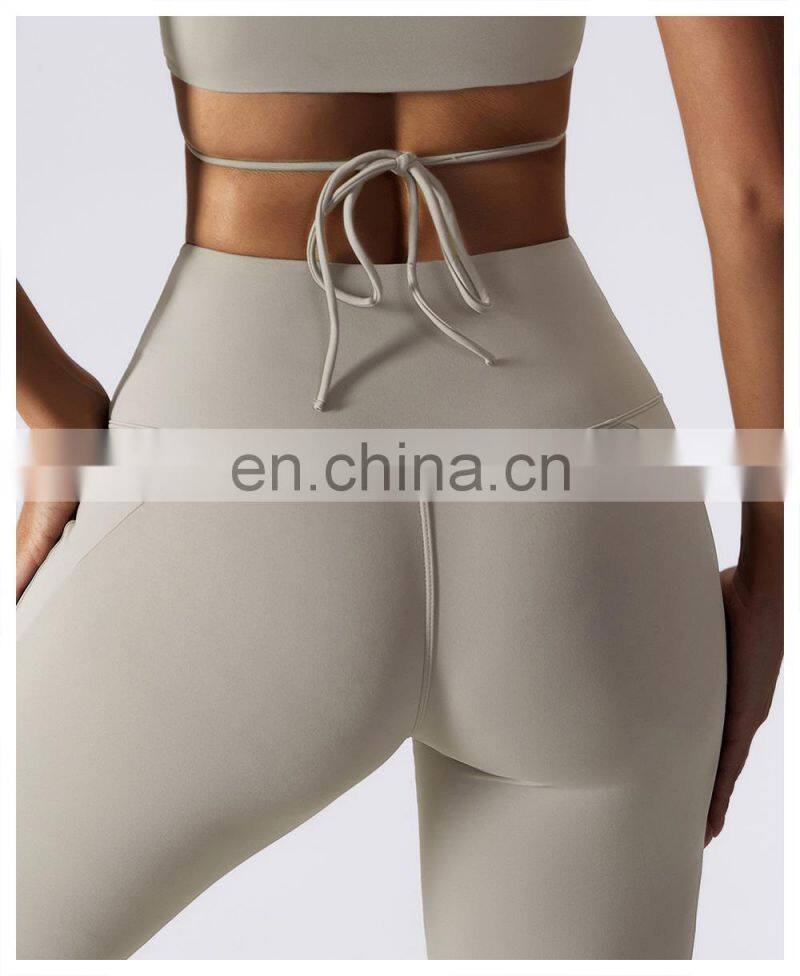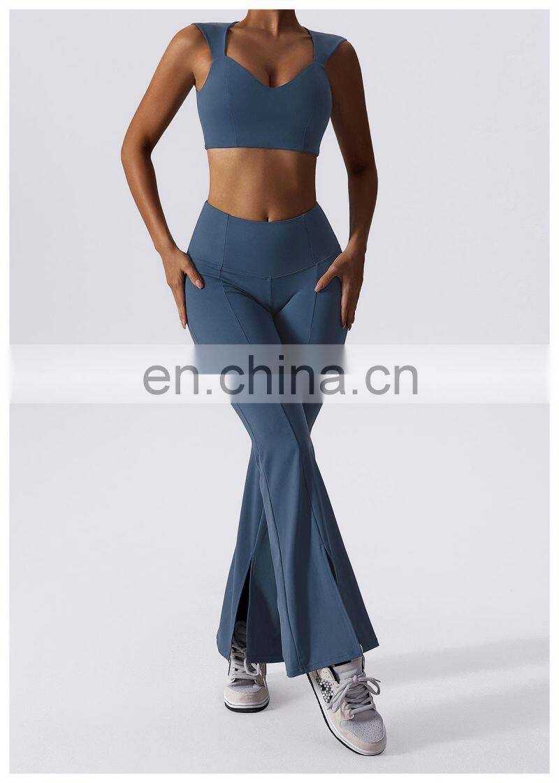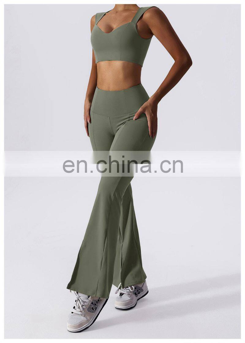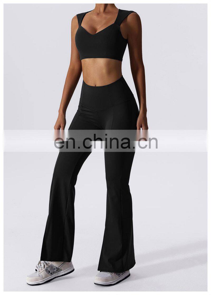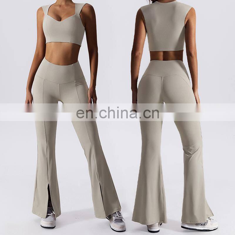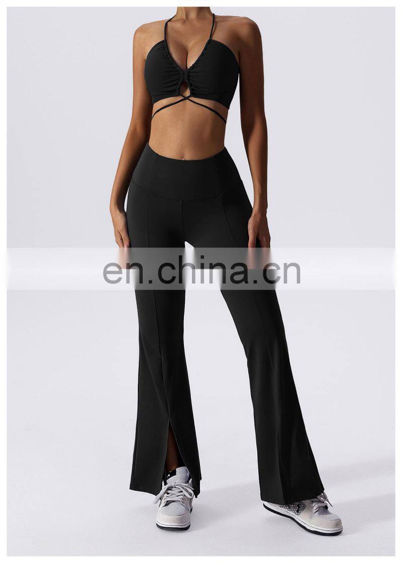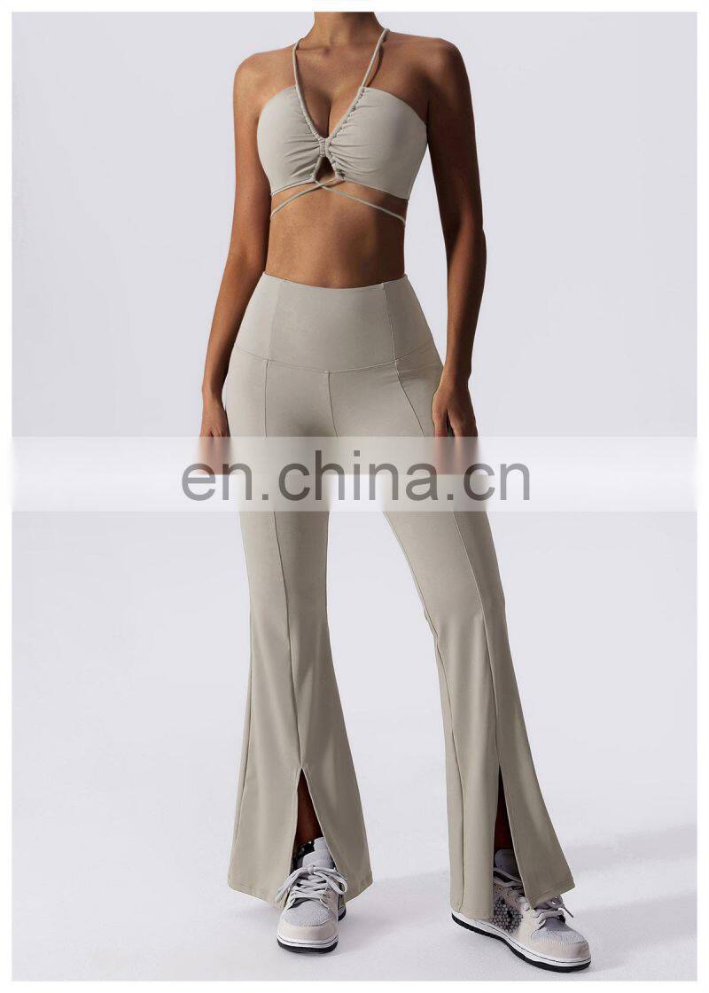 Home > Products > Gym Fitness Sets > New 2023 Sportswear Workout Sets 3 Piece Strappy Bra High Waist Flared Leggings Gym Fitness Sets Women Training Wear Clothing