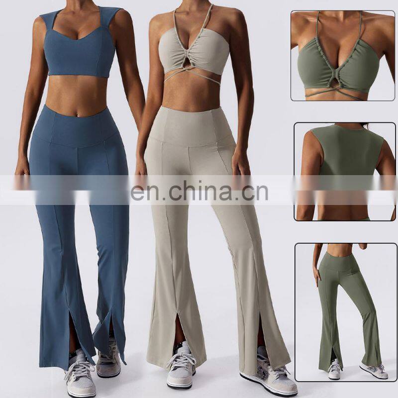 New 2023 Sportswear Workout Sets 3 Piece Strappy Bra High Waist Flared Leggings Gym Fitness Sets Women Training Wear Clothing