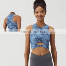 Ribbed Printing High Neck Shockproof Crop Yoga Sports Bra Anti-Bacterial Hollow Out Sexy Gym Fitness Bra For Women Workout Wear