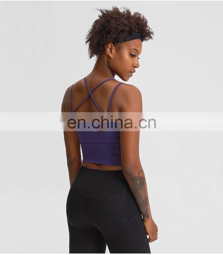 New Hot Sale Top Quality Breathable Back Cross Sports In Built Bra Top Workout Fitness Gym Wear Ladies Sexy Straps Yoga Crop Top