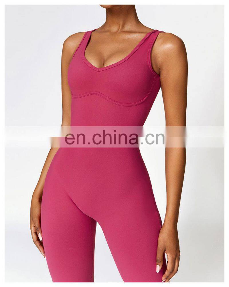 Quick Dry Sexy Large V-shaped Neckline Workout Bodysuit Gym Fitness Jumpsuits Sleeveless One Piece Yoga Jumpsuit For Women