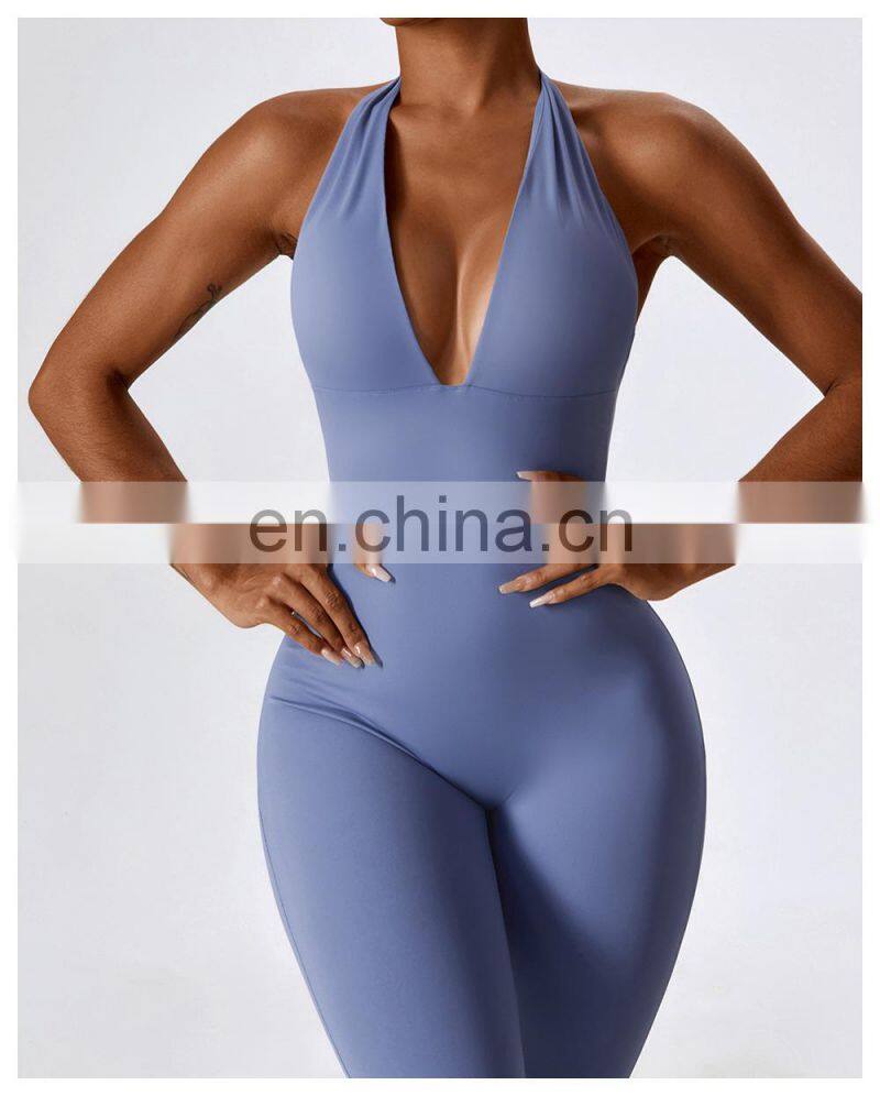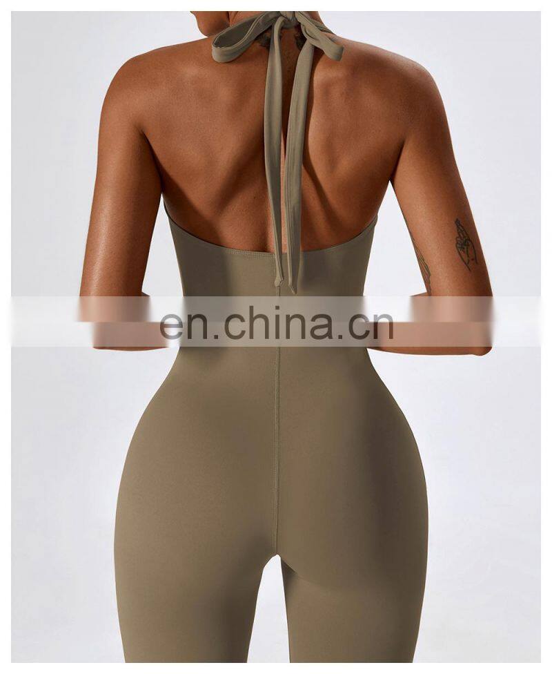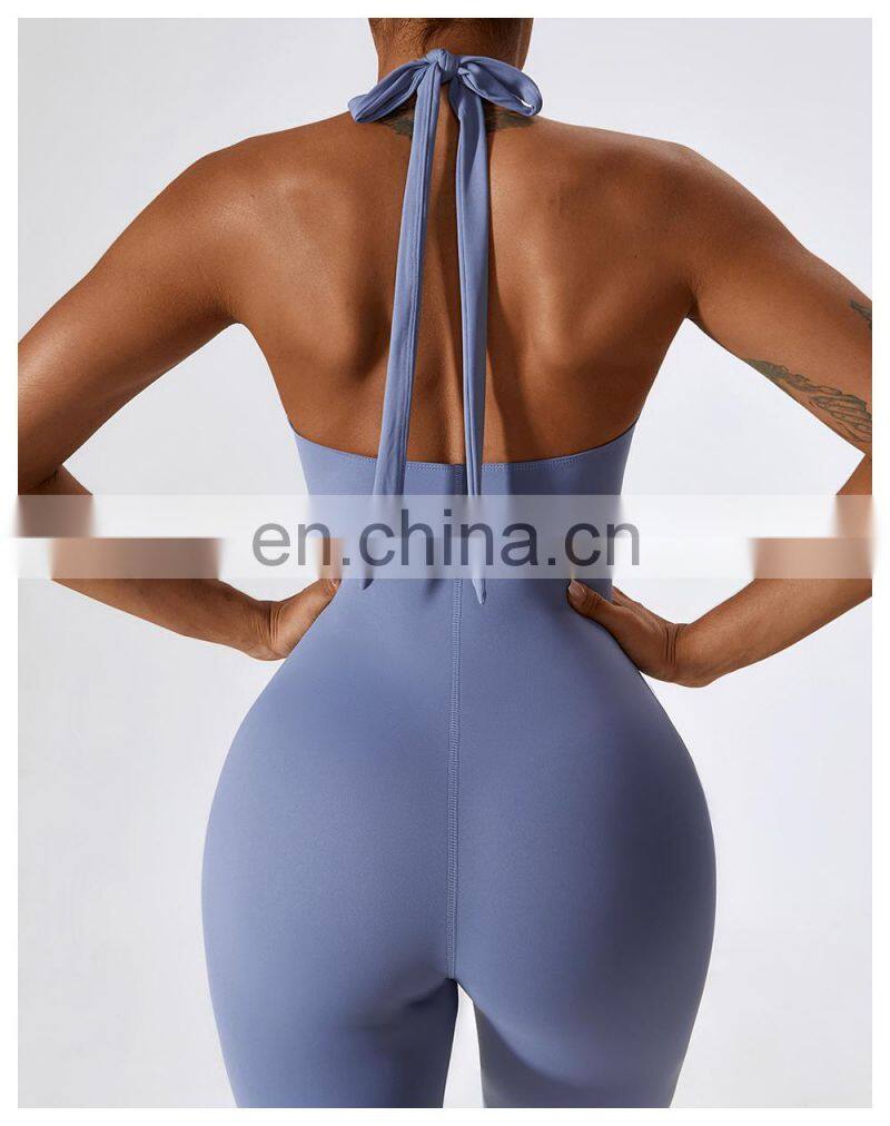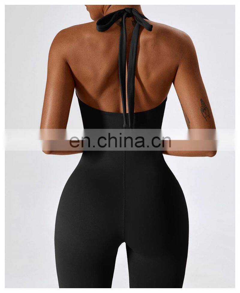 Open Back Sexy One Piece Dance Yoga Jumpsuit Ladies Gym Wear Backless Halter Neck Sports Fitness Jumpsuit Set For Women
