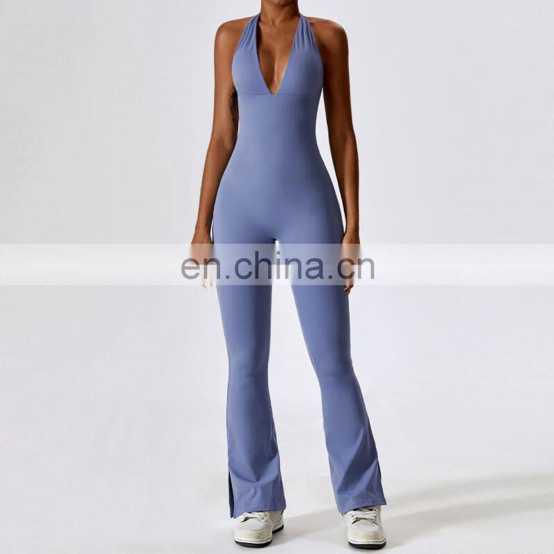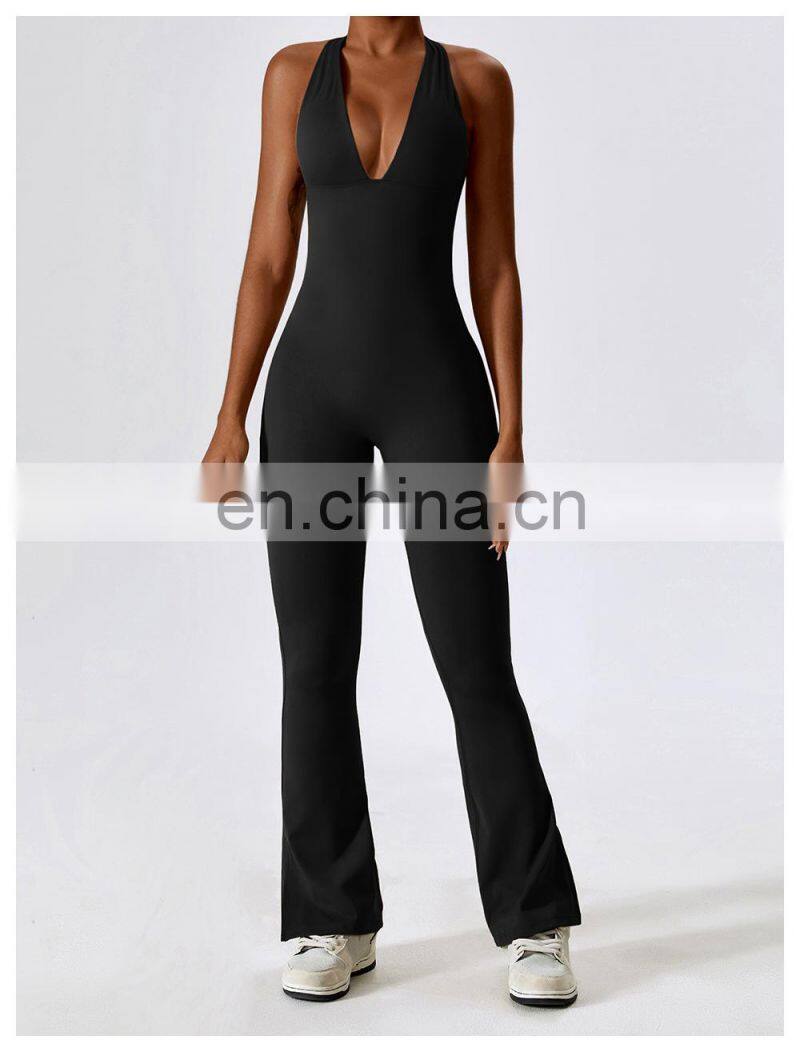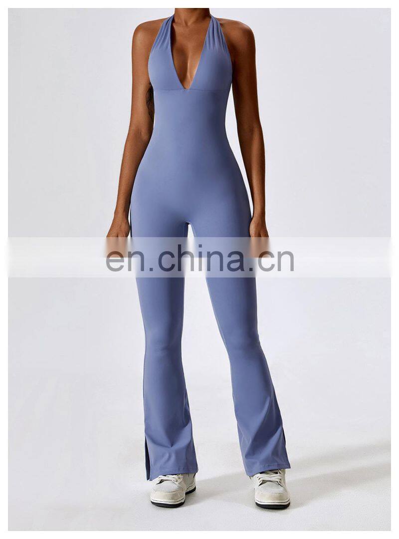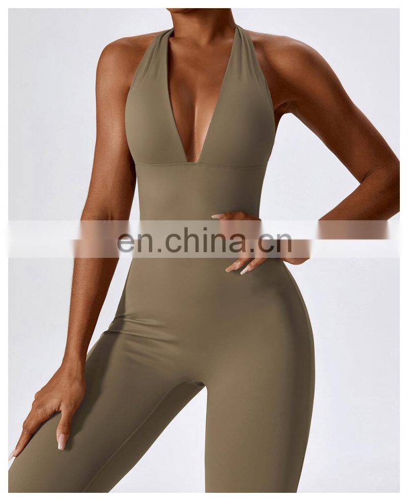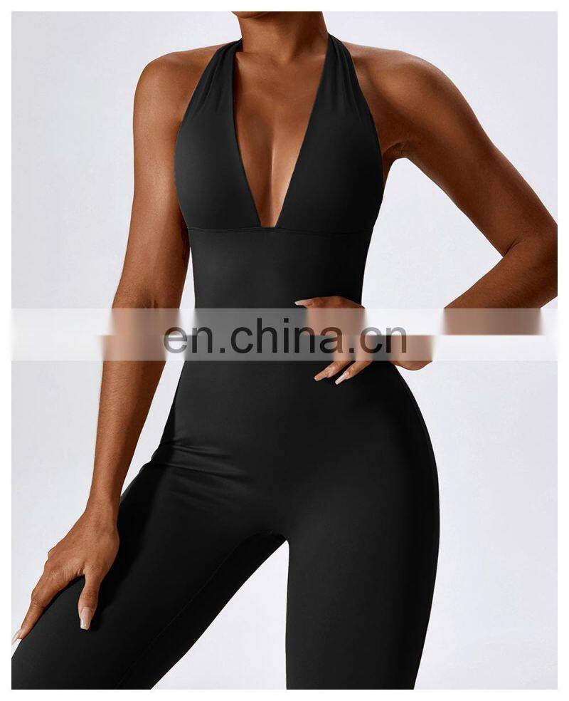 Open Back Sexy One Piece Dance Yoga Jumpsuit Ladies Gym Wear Backless Halter Neck Sports Fitness Jumpsuit Set For Women