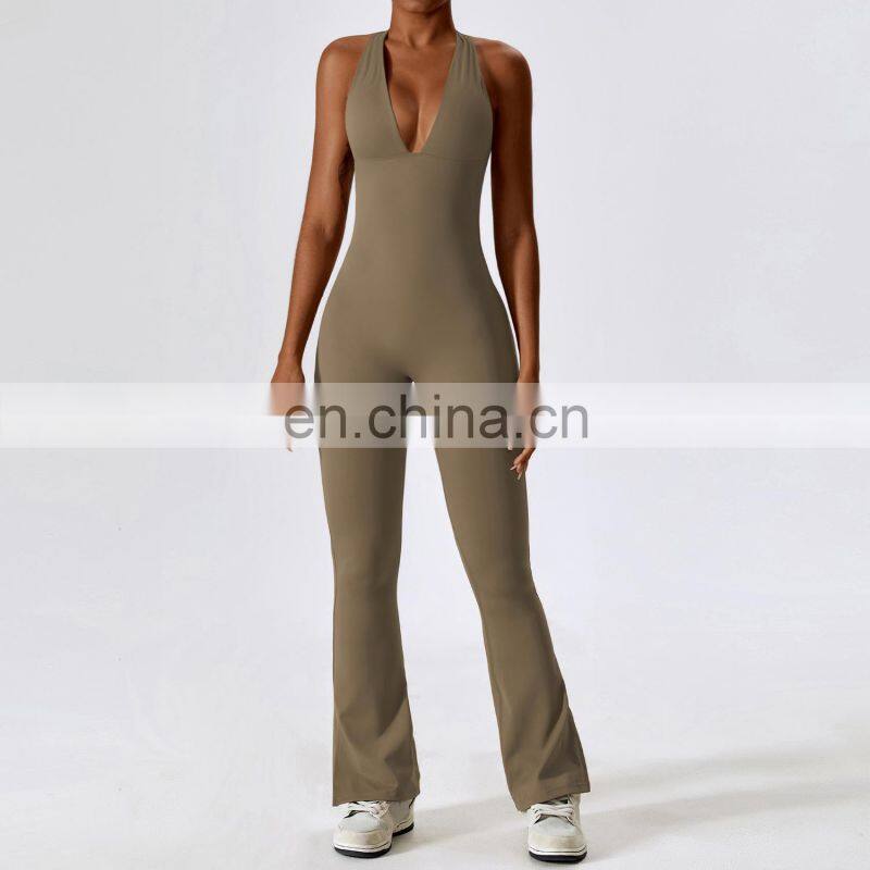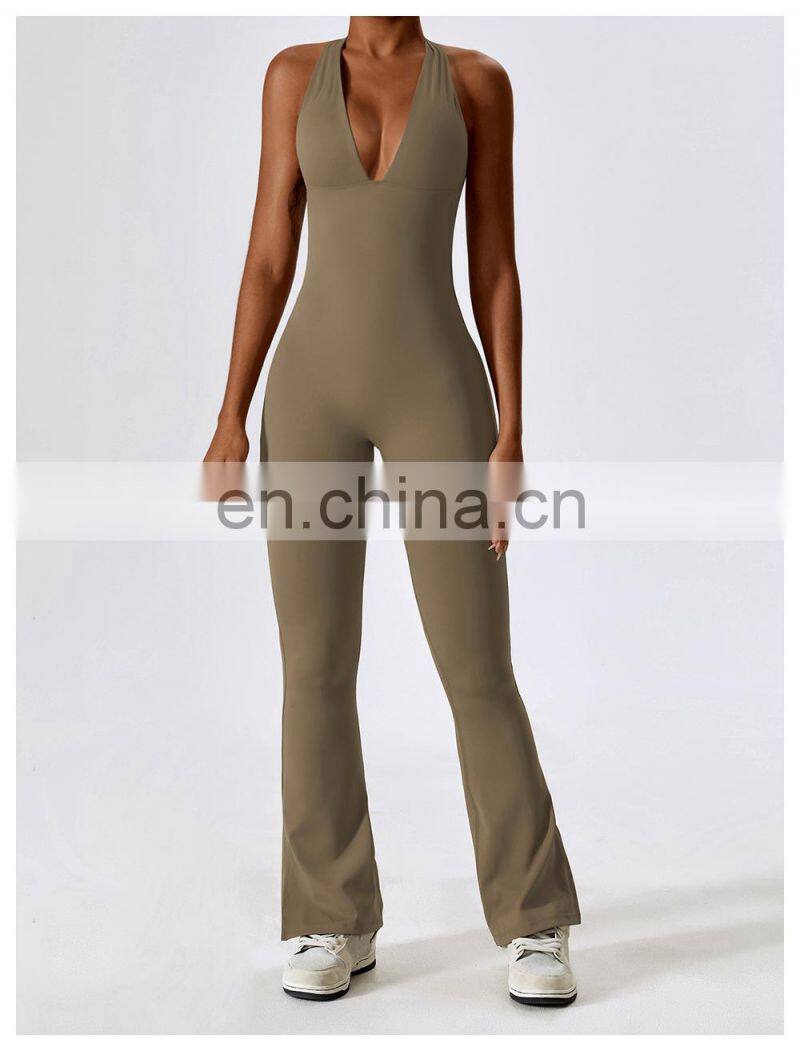 Ribbed Quick Dry Sports Clothing Halter Backless Flare Rompers Bodysuit Gym Fitness Jumpsuits One Piece Yoga Jumpsuit For Women