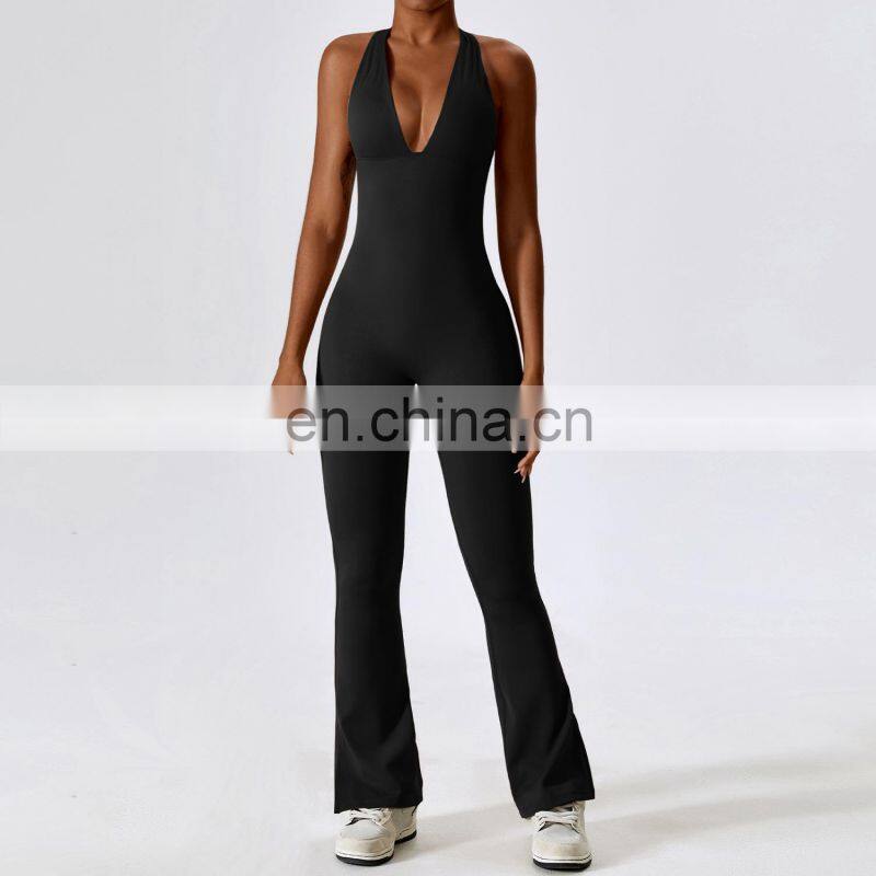Quick Dry Sexy Large V-shaped Neckline Workout Bodysuit Gym Fitness Jumpsuits Sleeveless One Piece Yoga Jumpsuit For Women