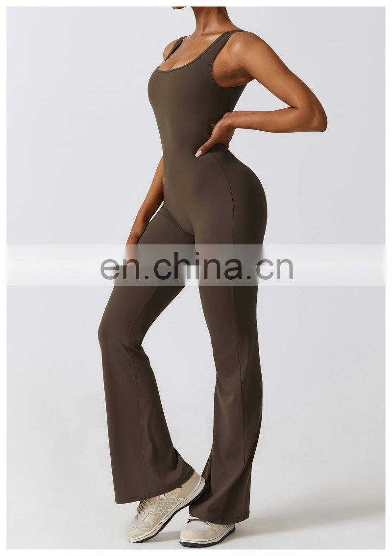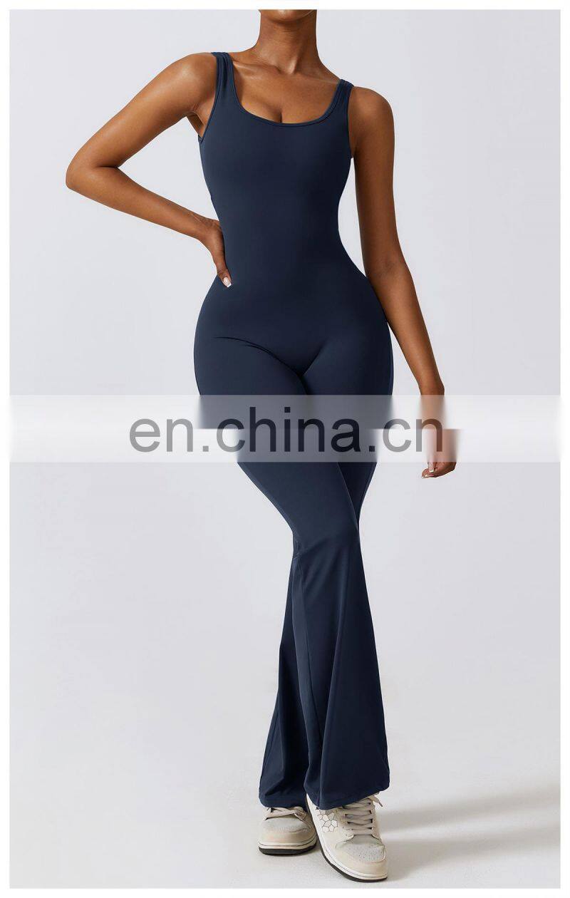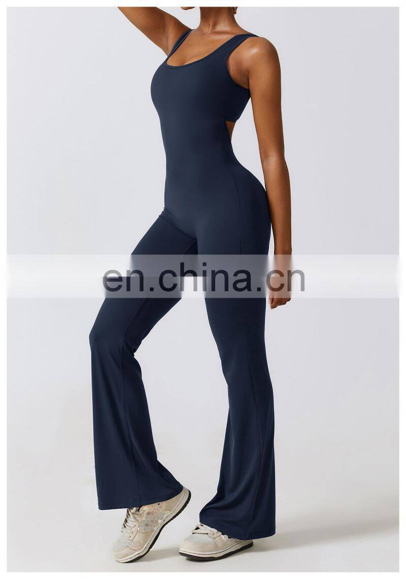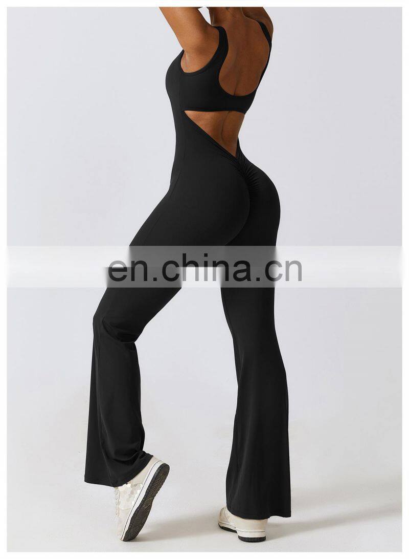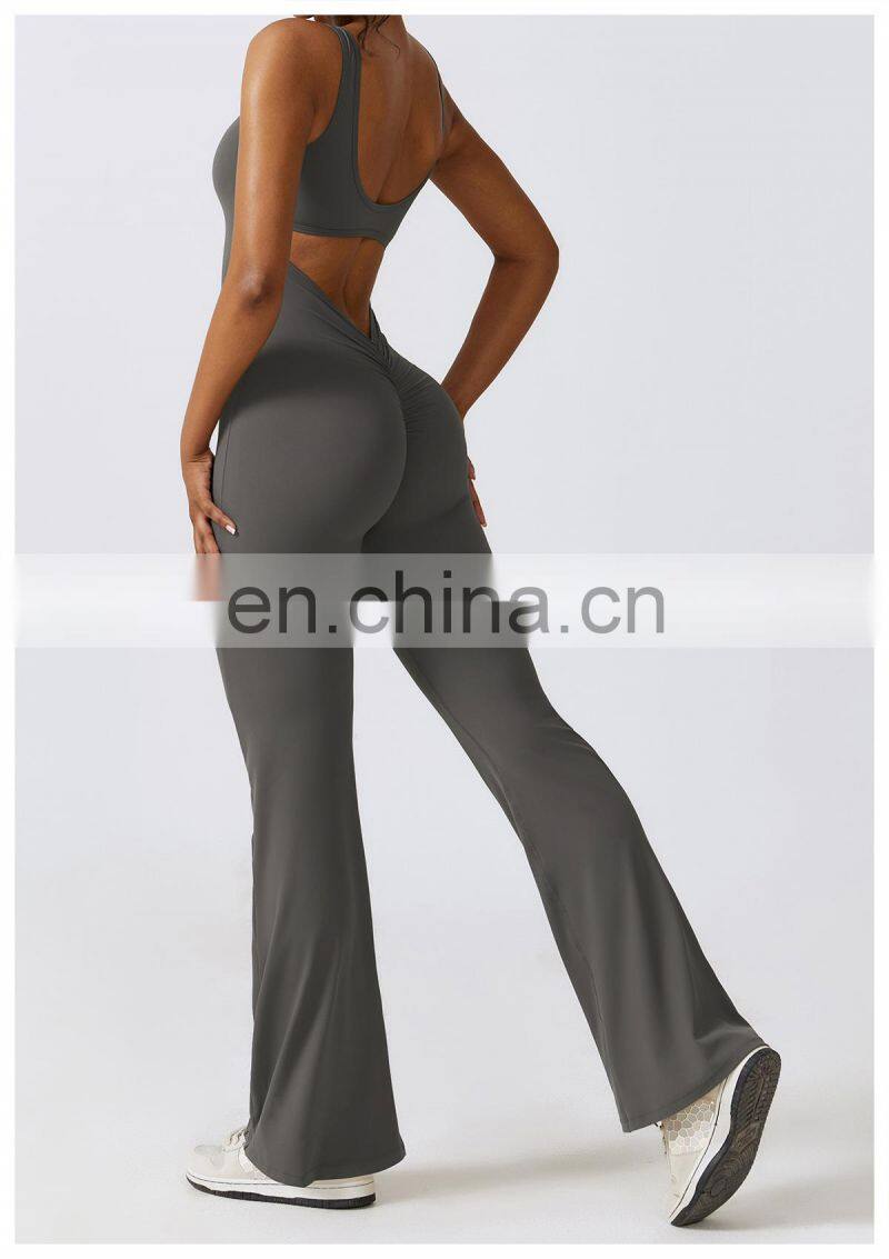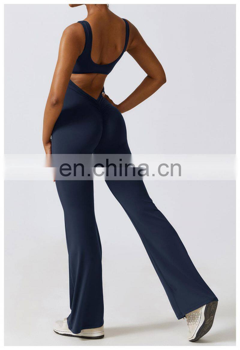 Ribbed Quick Dry Sports Clothing Halter Backless Flare Rompers Bodysuit Gym Fitness Jumpsuits One Piece Yoga Jumpsuit For Women