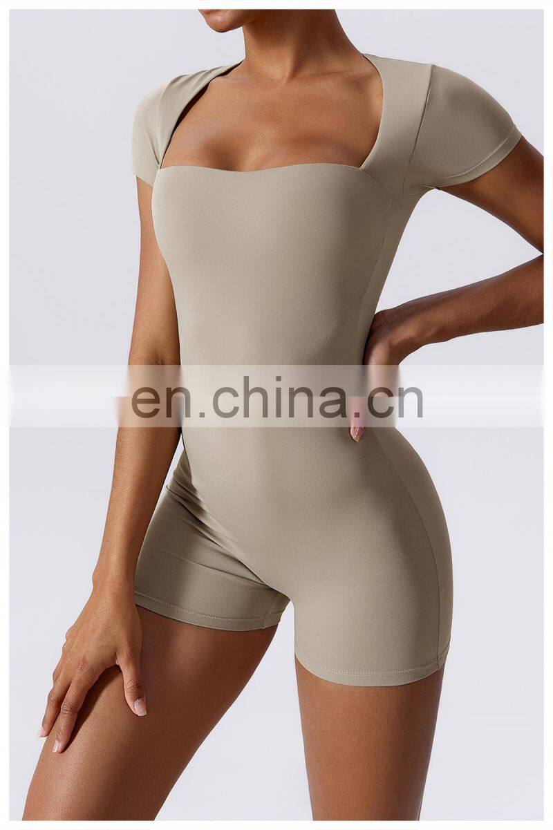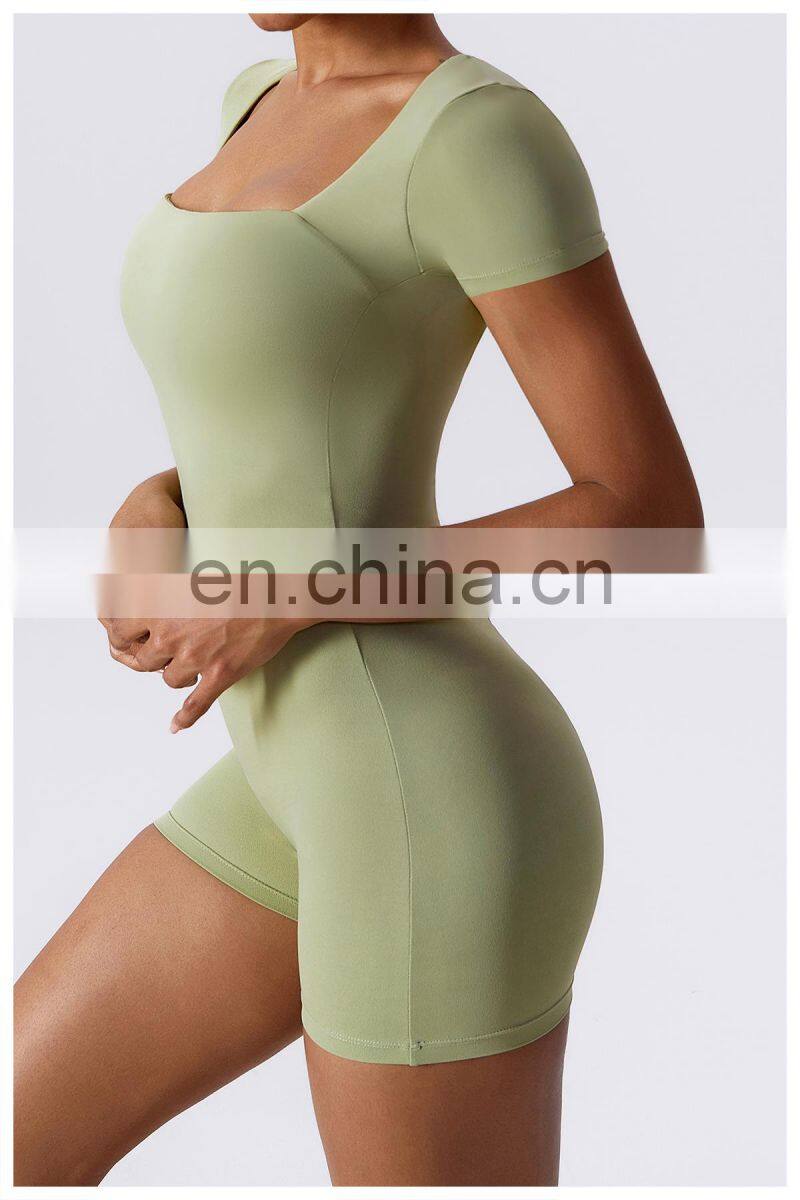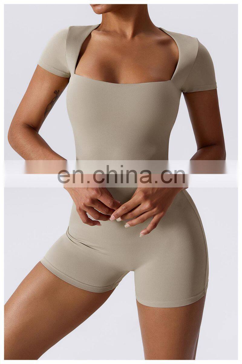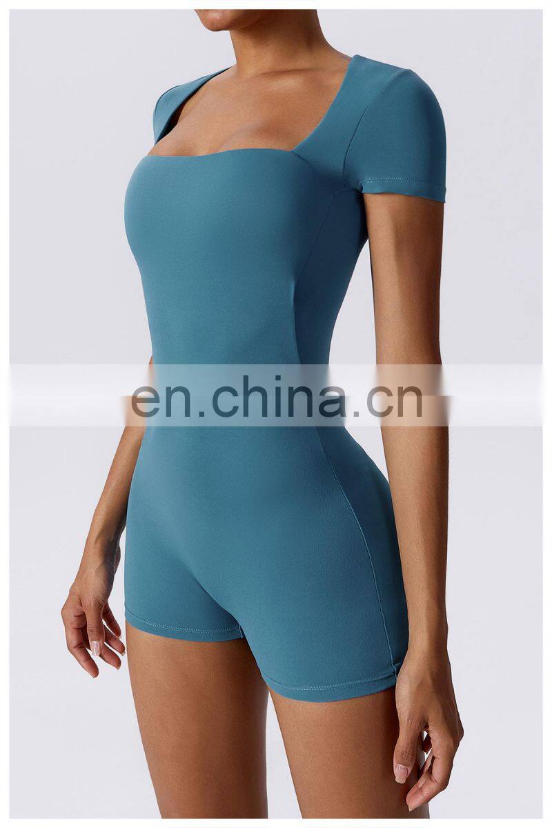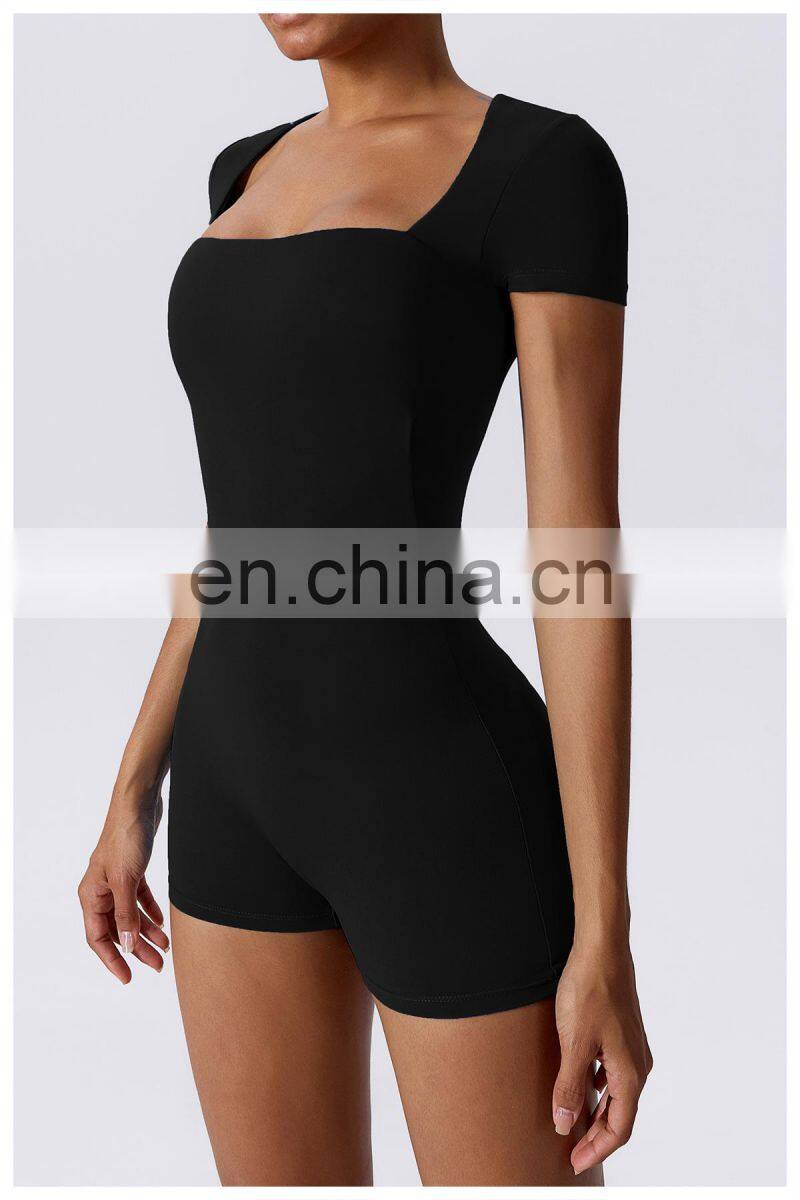 Gym Fitness Sexy One Piece Square Neck Built In Bra Short Sleeve Shorts Yoga Dance Jumpsuit Women Workout Training Sports Wear