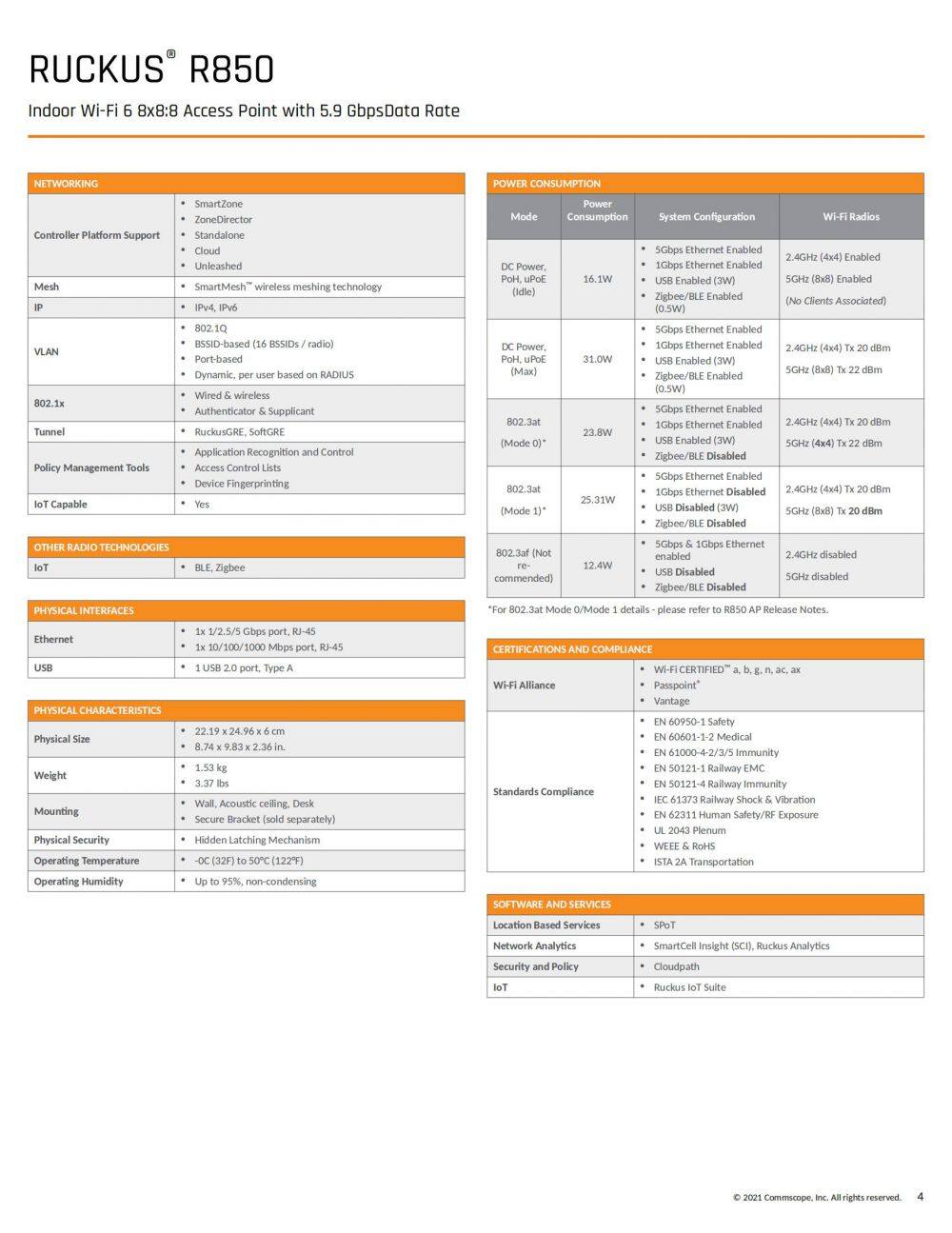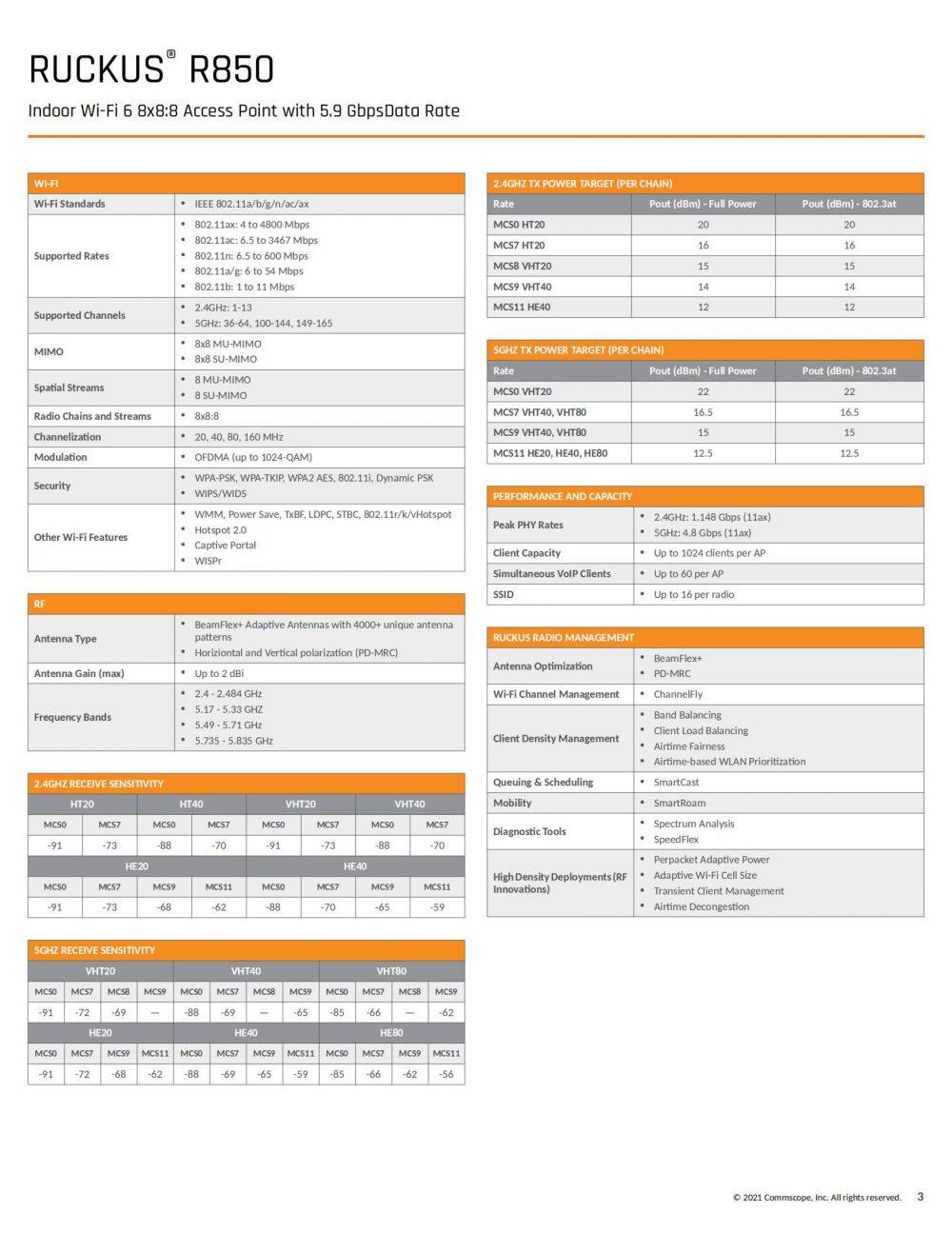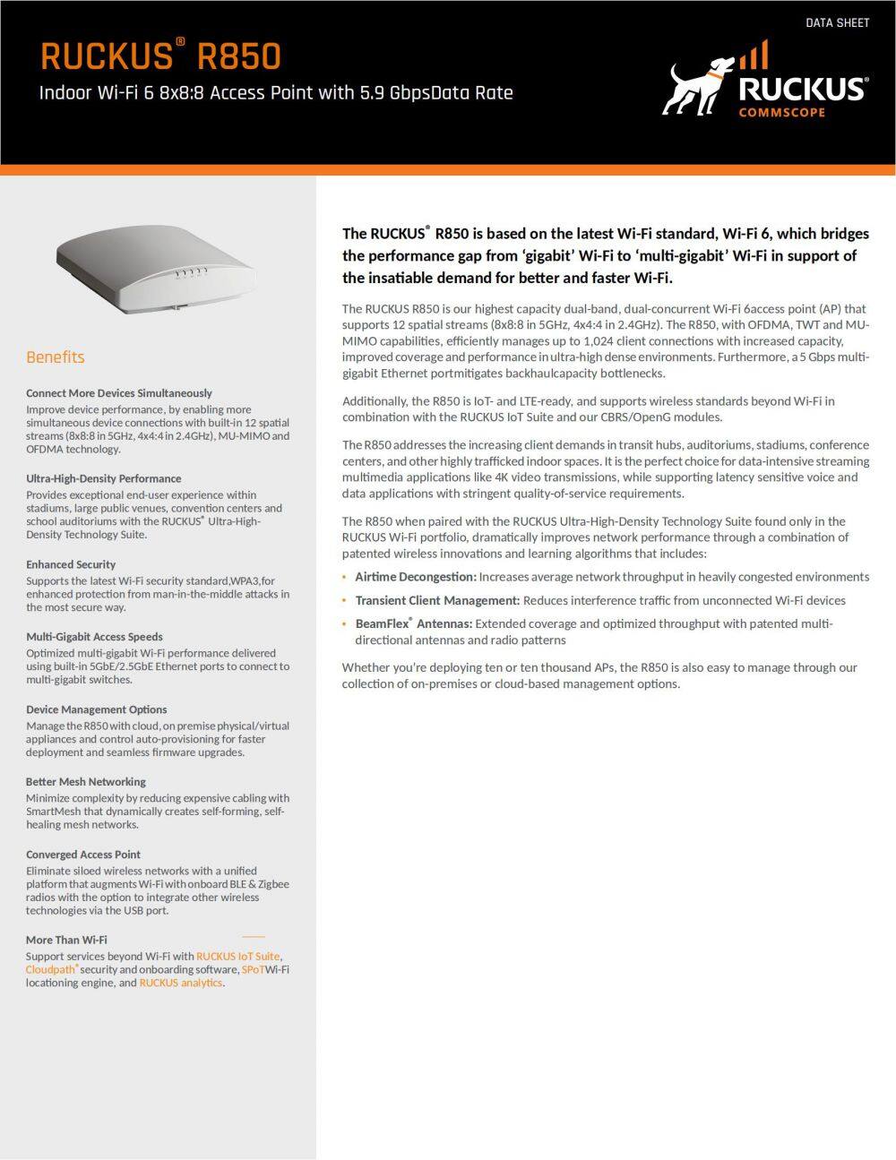 The R850 is our highest capacity dual-band, dual-concurrent Wi-Fi 6 (802.11ax) access point (AP) that supports 12 spatial streams (8x8:8 in 5GHz, 4x4:4 in 2.4GHz). The R850, with OFDMA and MU-MIMO capabilities, efficiently manages up to 1,024 client connections with increased capacity, improved coverage and performance in ultra-high dense environments.