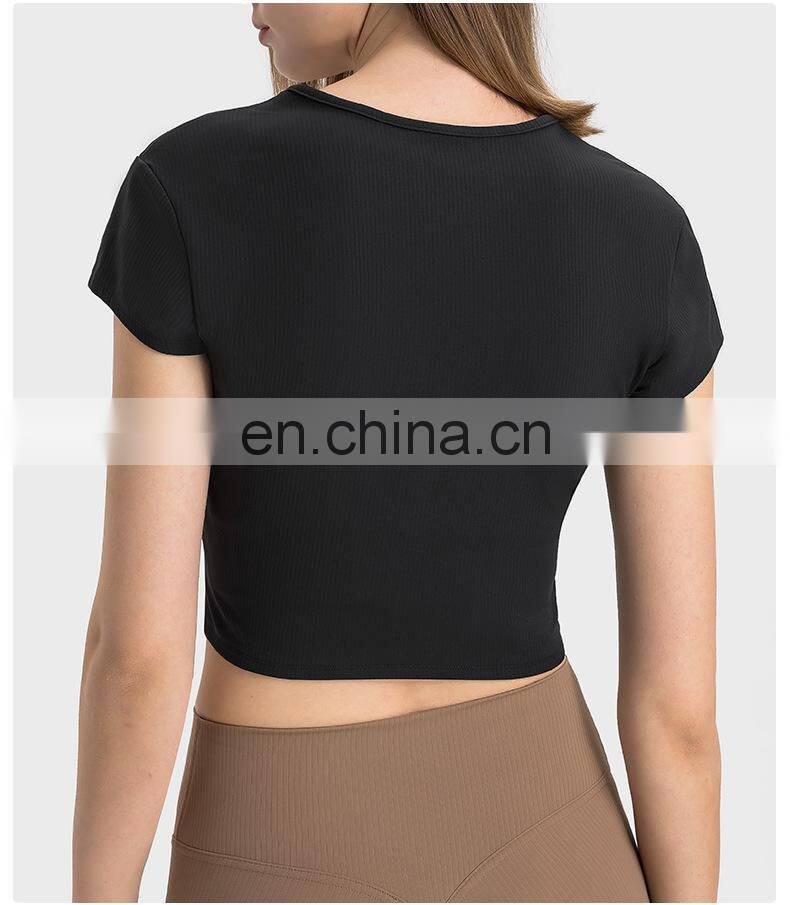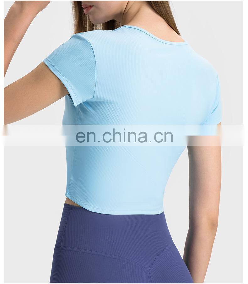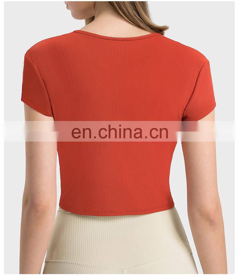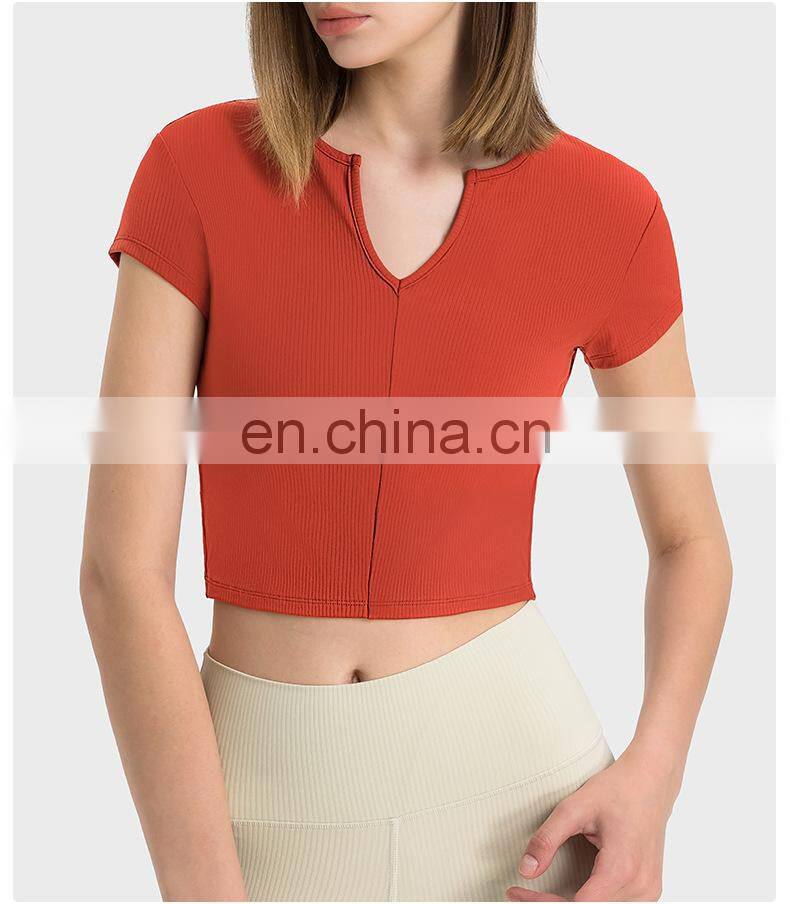 Summer Breathable Women Fitness Gym Yoga Wear Ribbed Short Sleeve V Neck Crop Top Ladies Workout Sports Training T Shirt Apparel