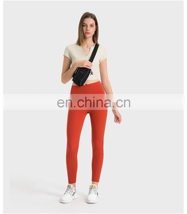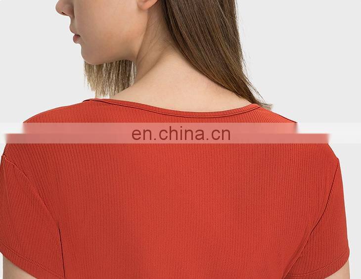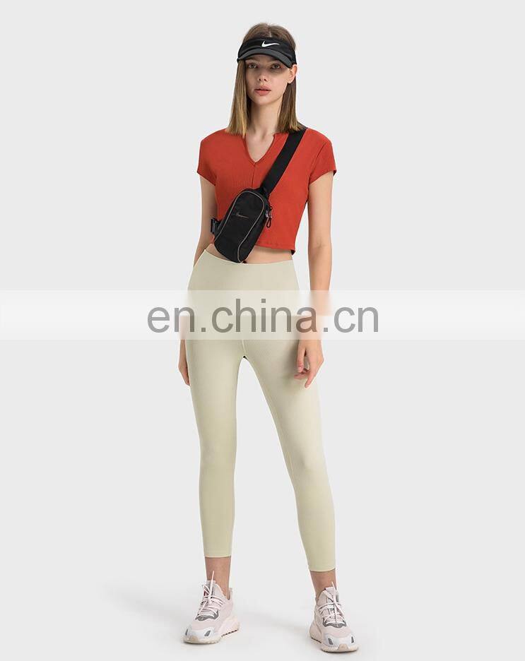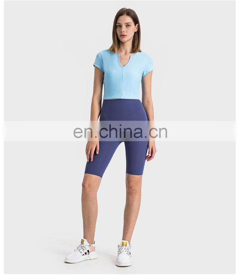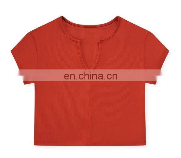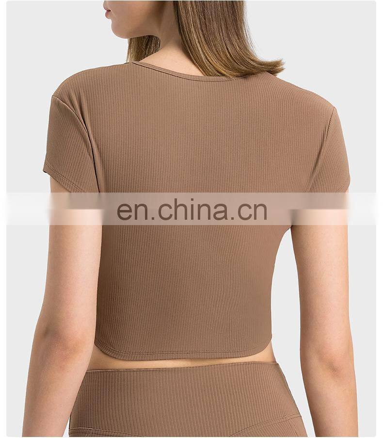 Summer Breathable Women Fitness Gym Yoga Wear Ribbed Short Sleeve V Neck Crop Top Ladies Workout Sports Training T Shirt Apparel