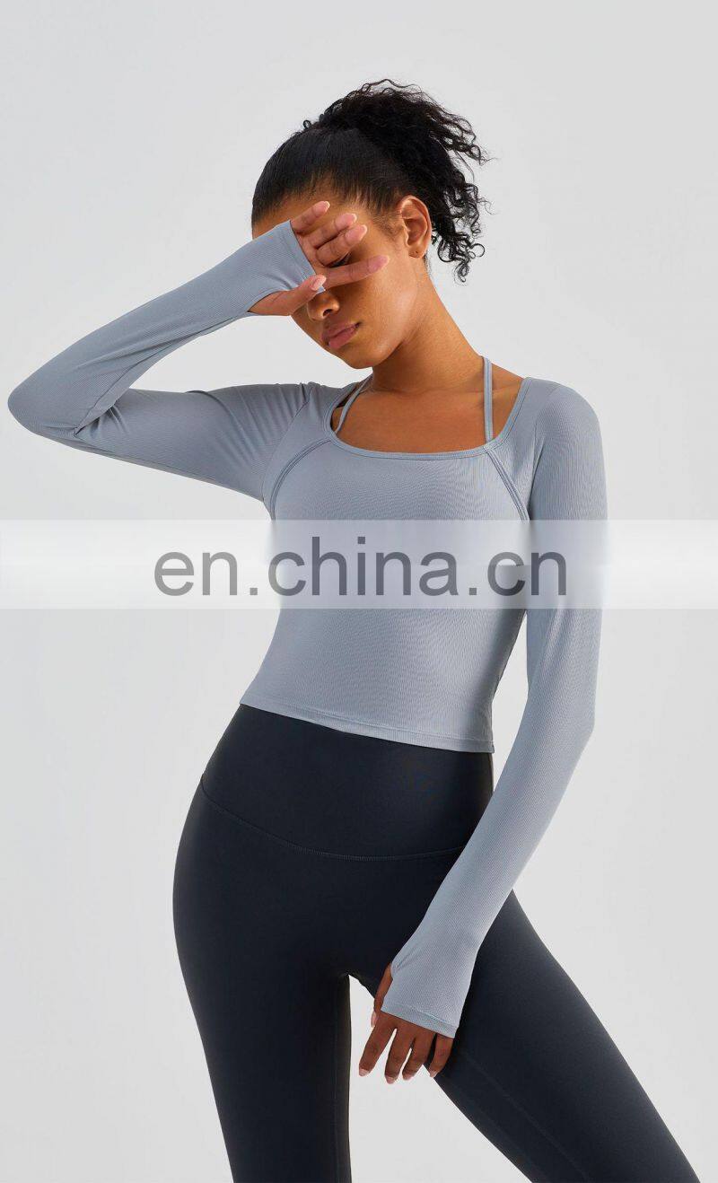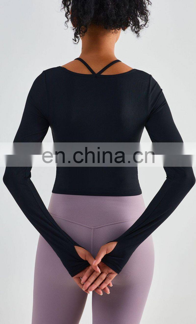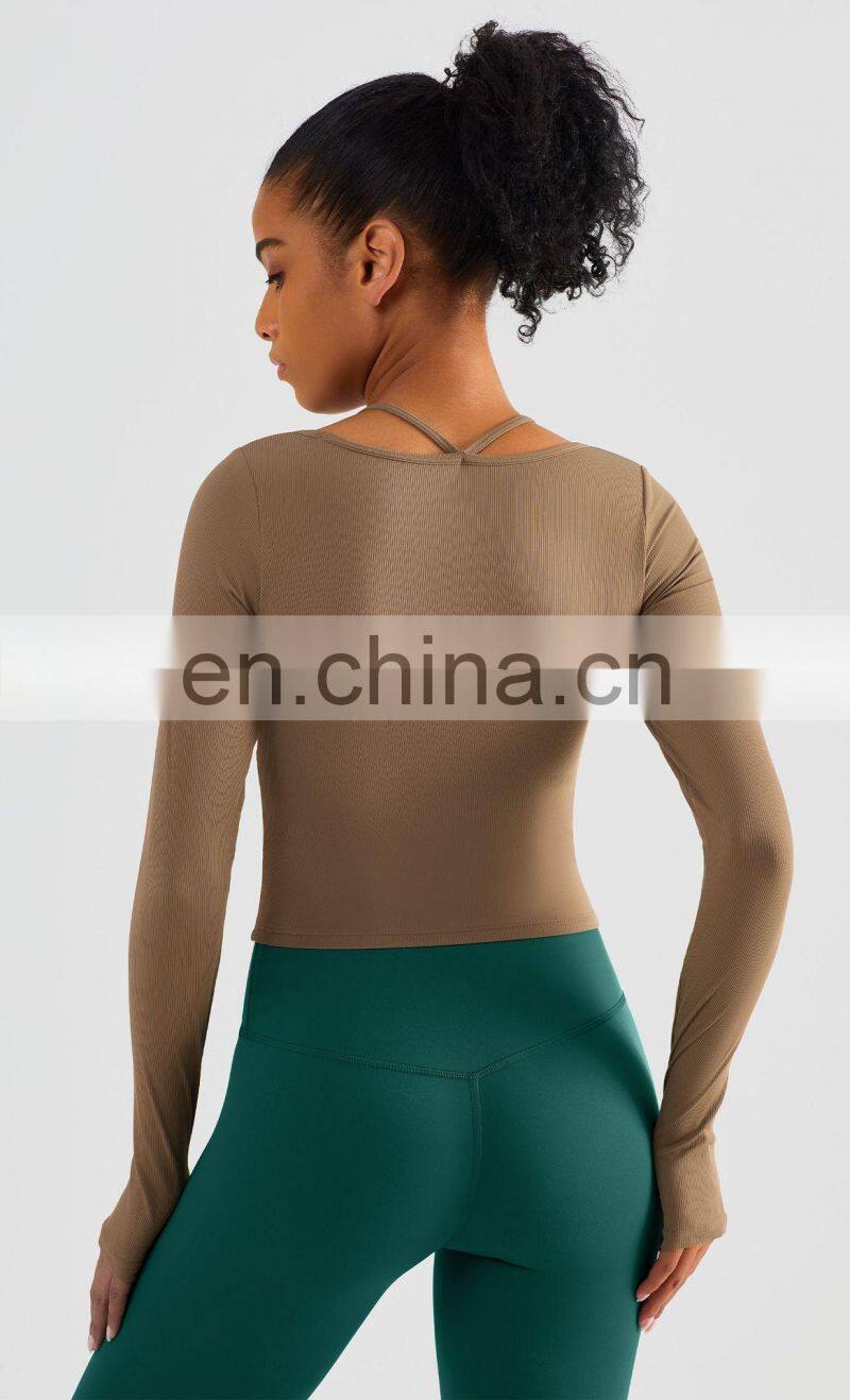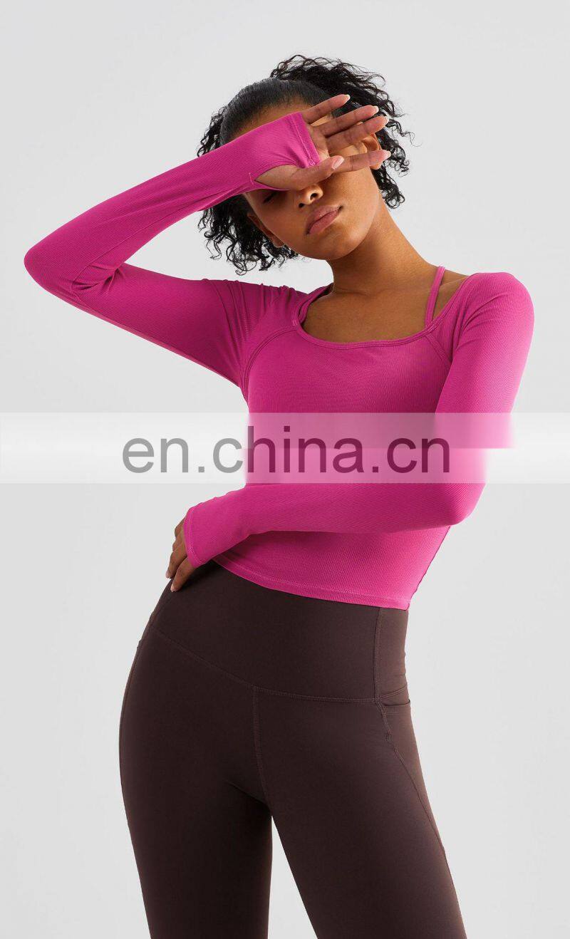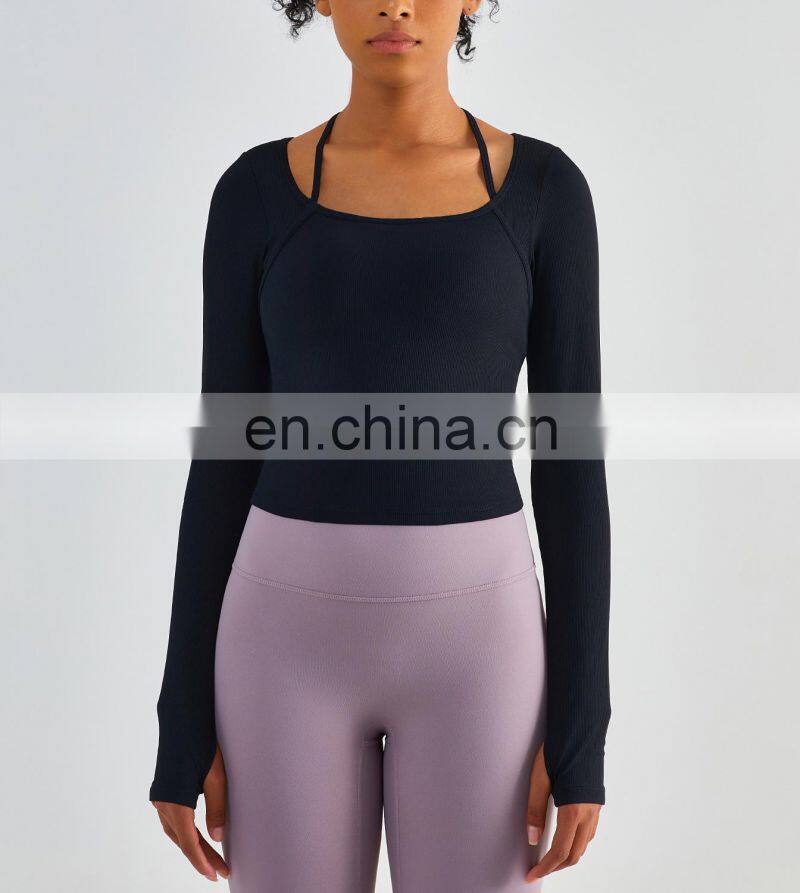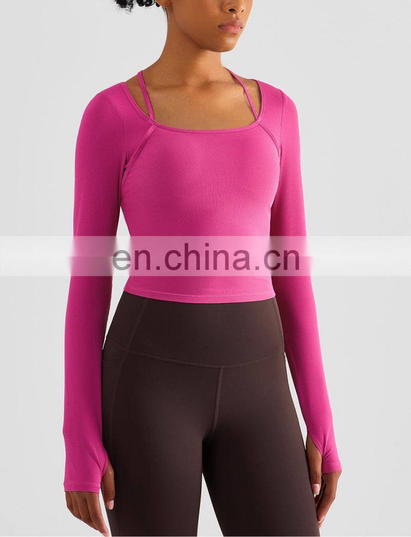Wholesale Athletic Wear Running Workout Clothes Woman Gym Crop Top Ribbed Built In Bra T-Shirt Fitness Slim Fit Long Sleeve Top