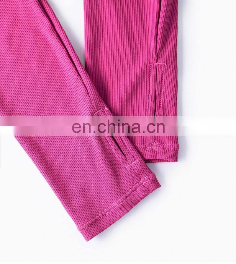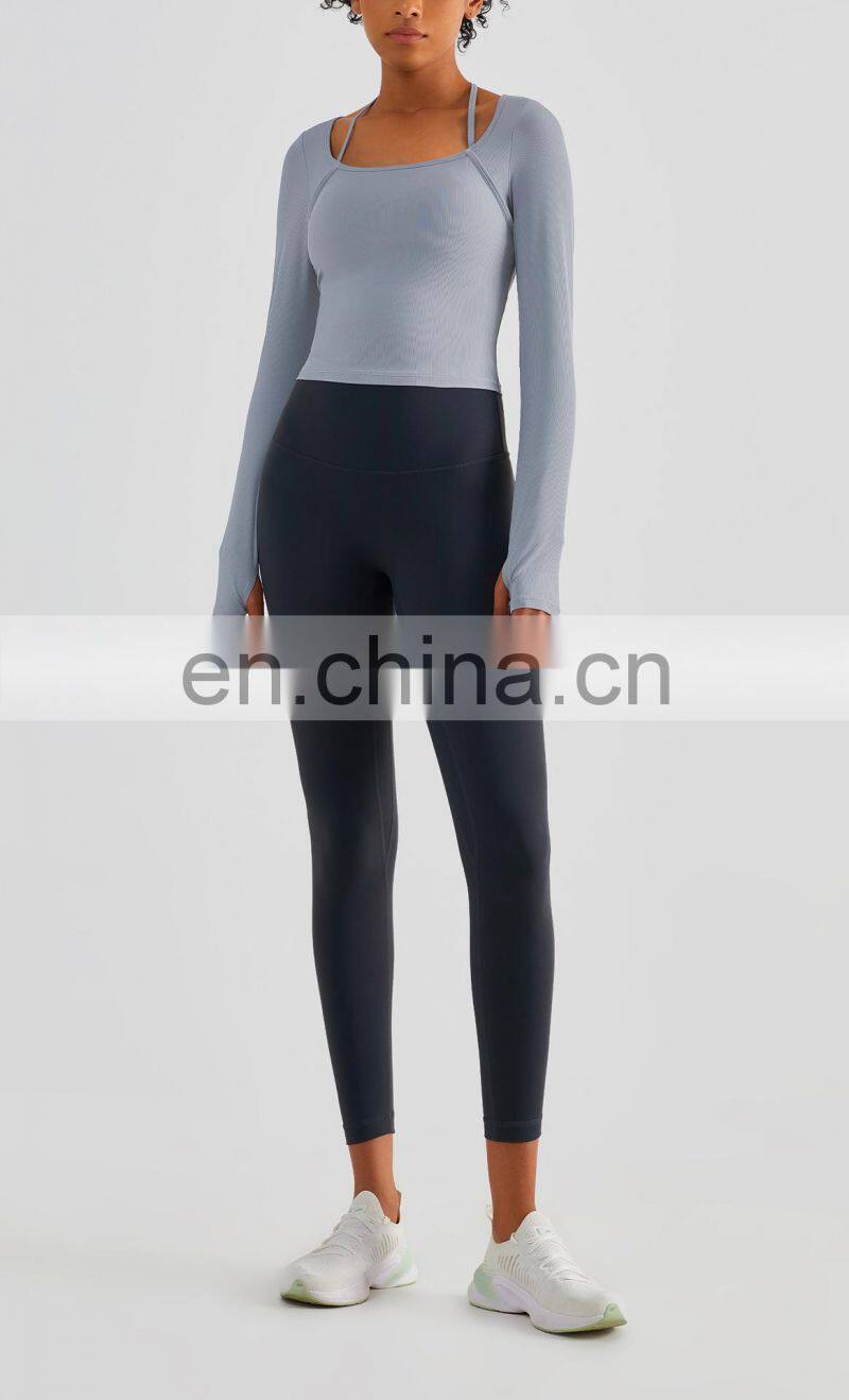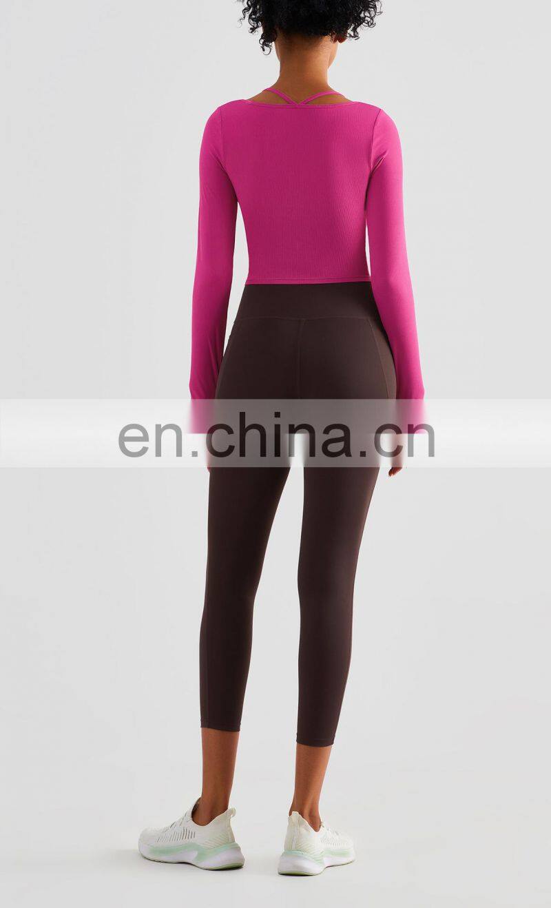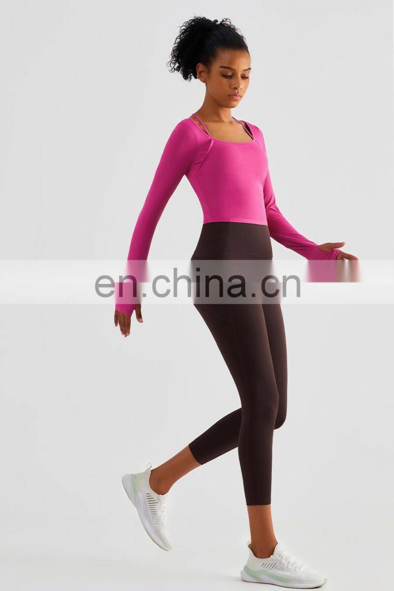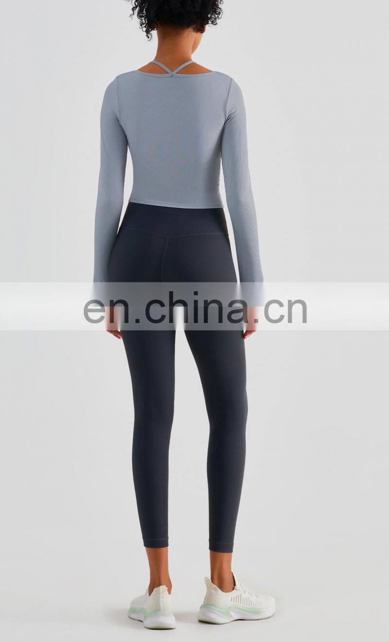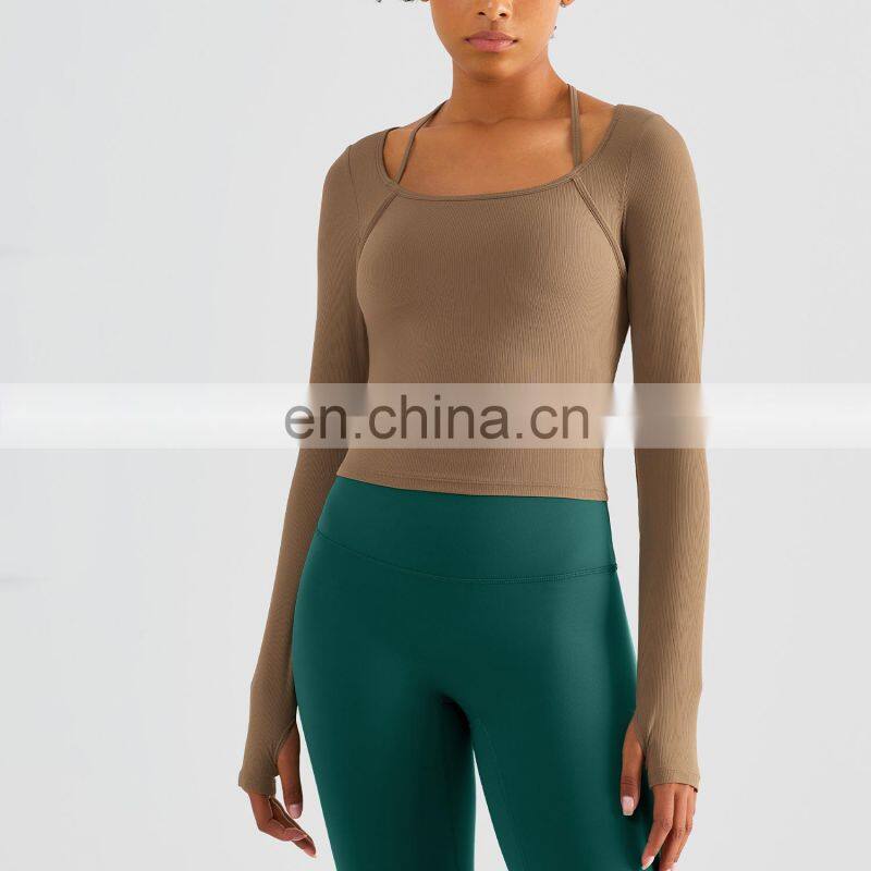 Wholesale Athletic Wear Running Workout Clothes Woman Gym Crop Top Ribbed Built In Bra T-Shirt Fitness Slim Fit Long Sleeve Top
