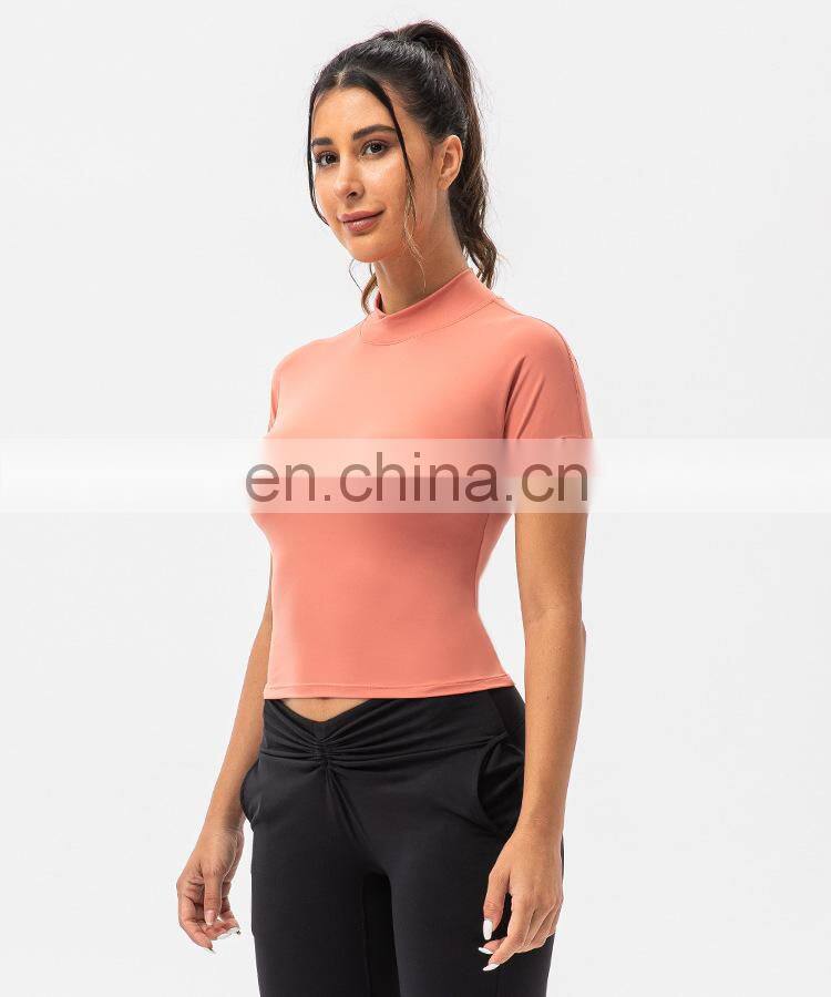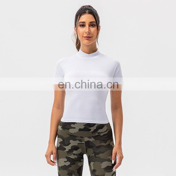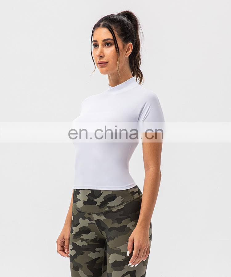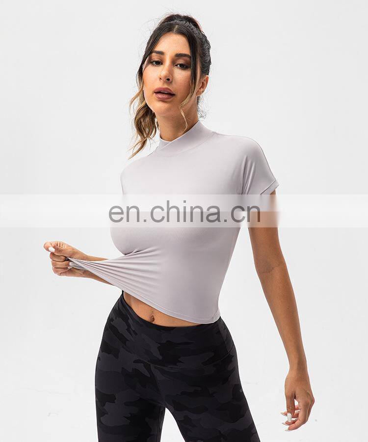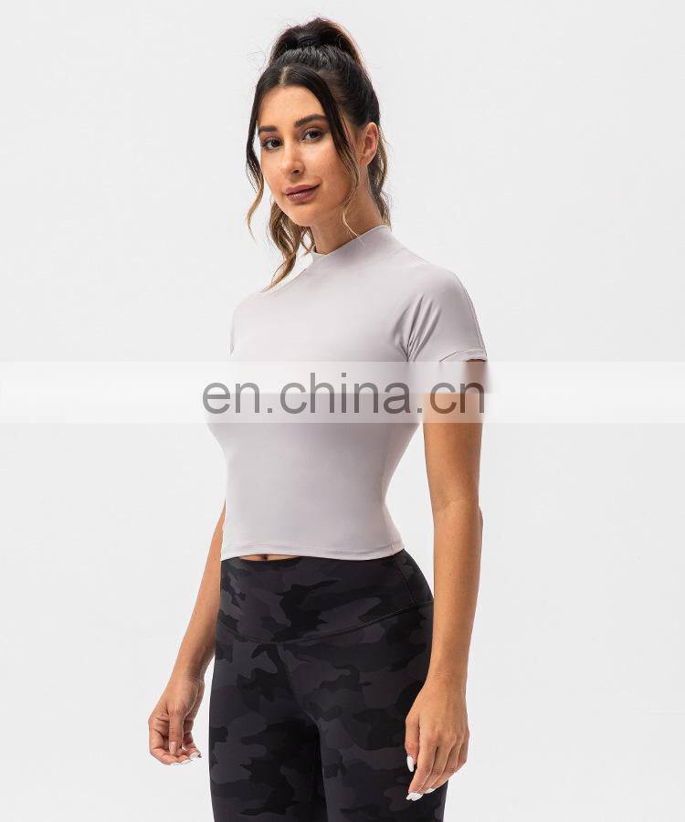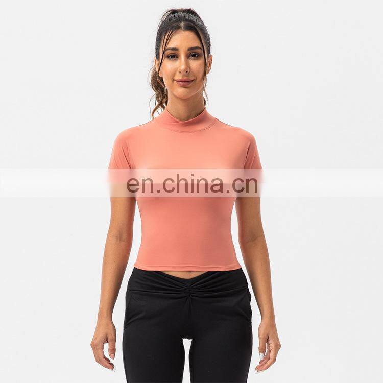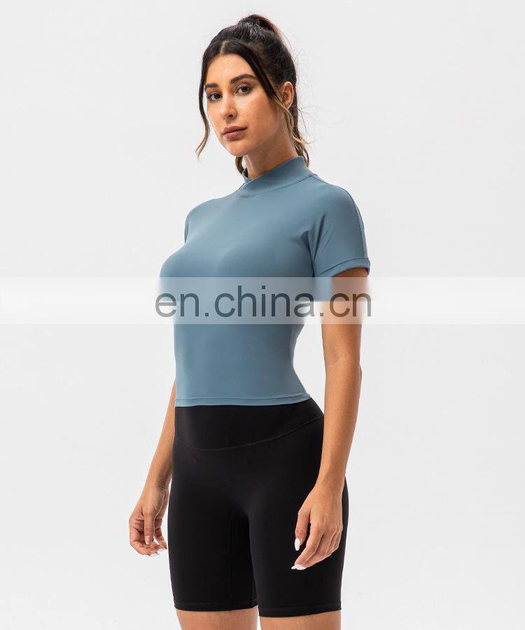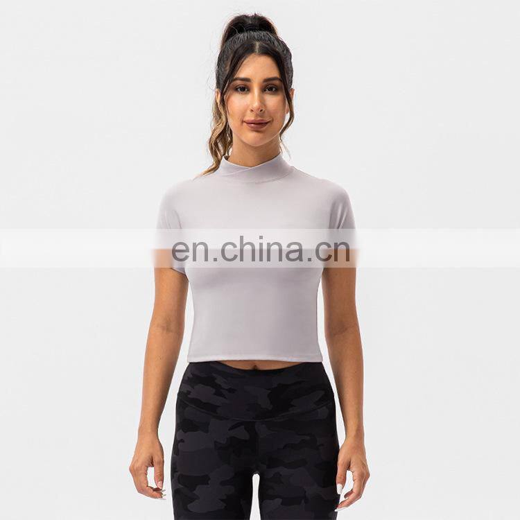 Wholesale New High Neck Slim Fit Sport Yoga Shirt Ladies Gym Fitness Wear Short Sleeve Top Sweat-Wicking Crop Tracksuit