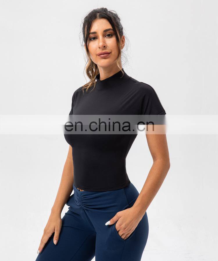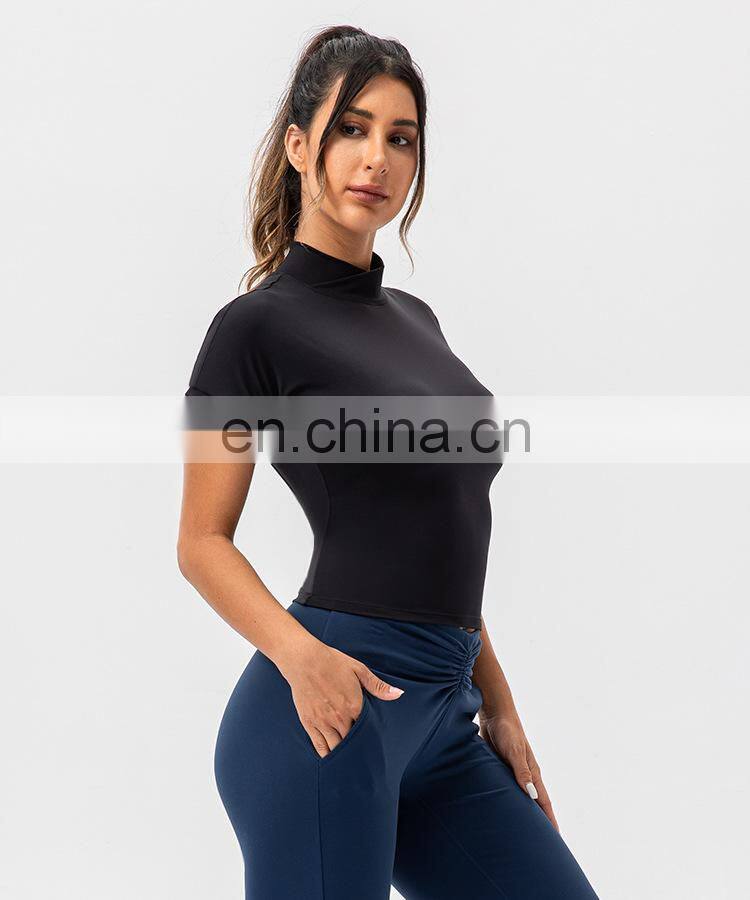 Home > Products > Yoga T shirt > Wholesale New High Neck Slim Fit Sport Yoga Shirt Ladies Gym Fitness Wear Short Sleeve Top Sweat-Wicking Crop Tracksuit