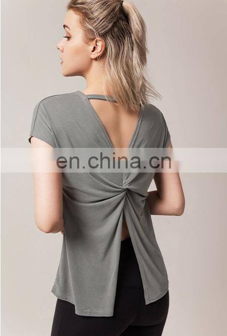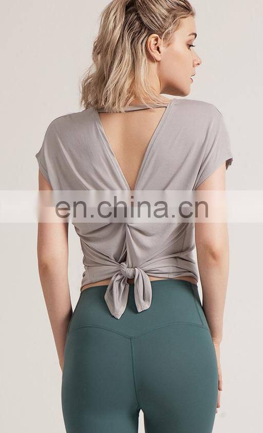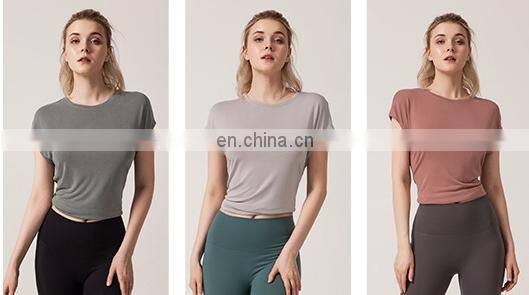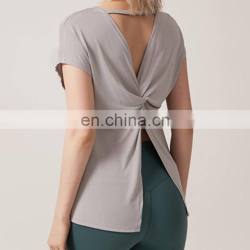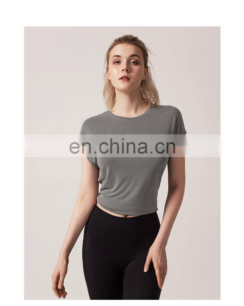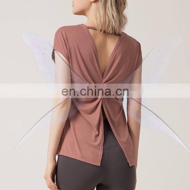 1 Pcs Custom Logo Split Back Design Modal Blouse Short Sleeve Breathable Yoga Shirt Women Casual Running Gym Wear Sports Top