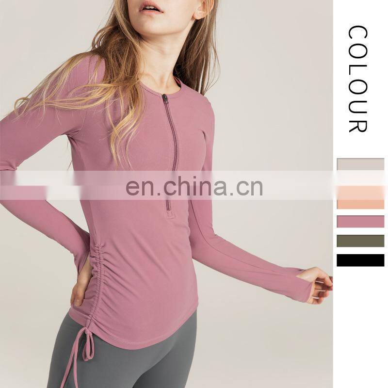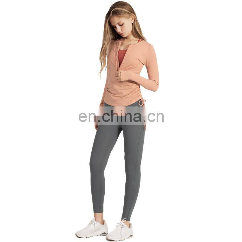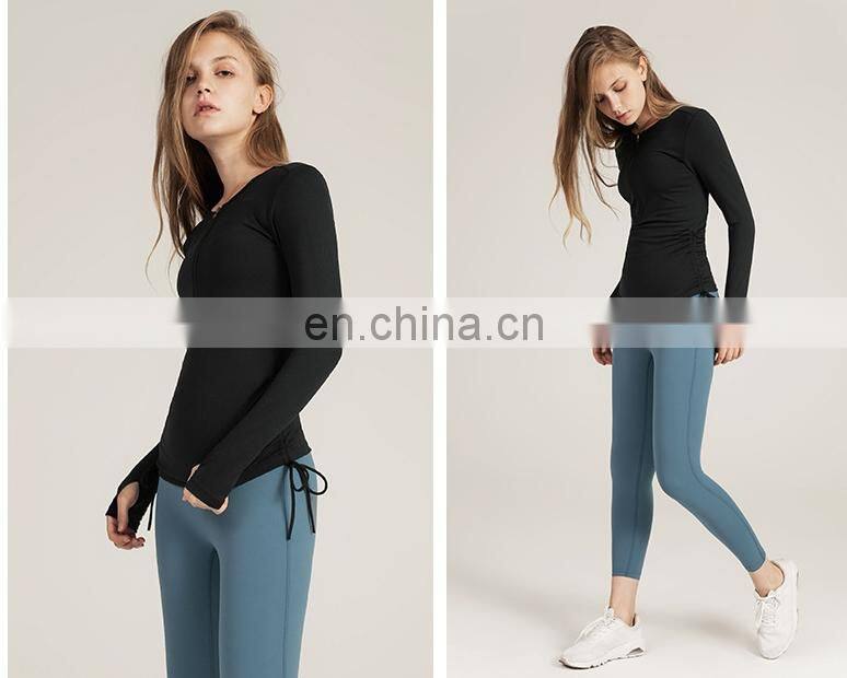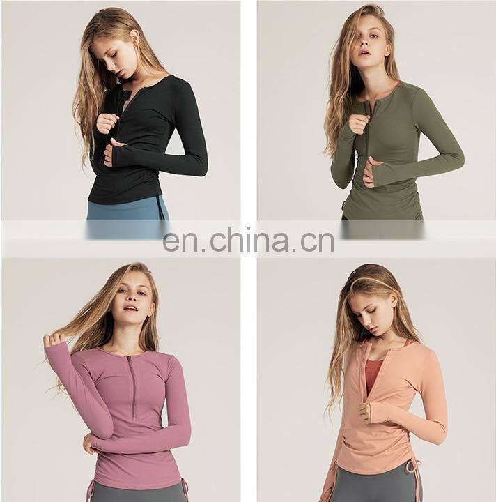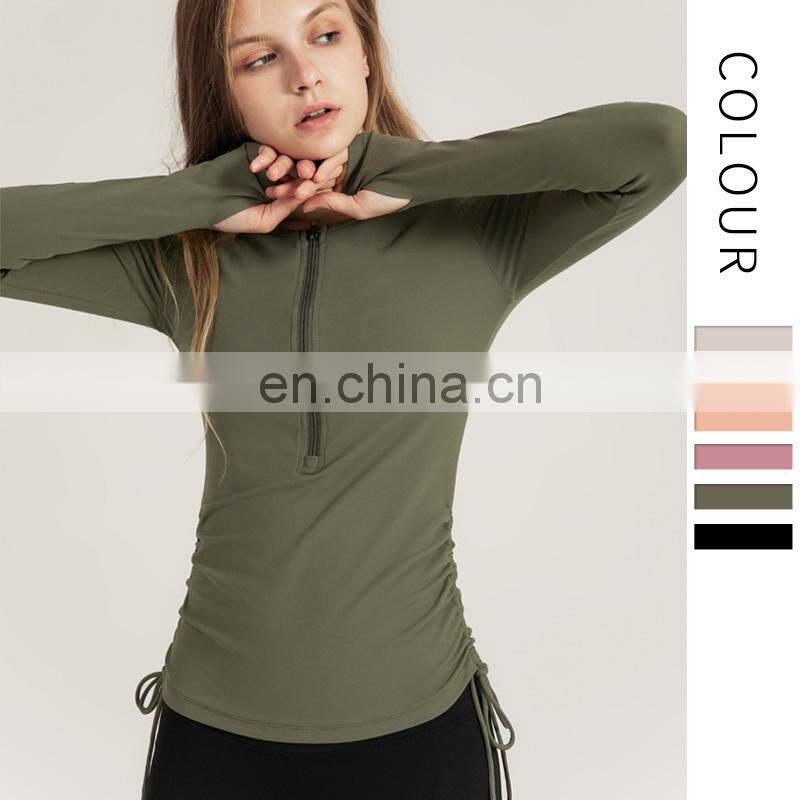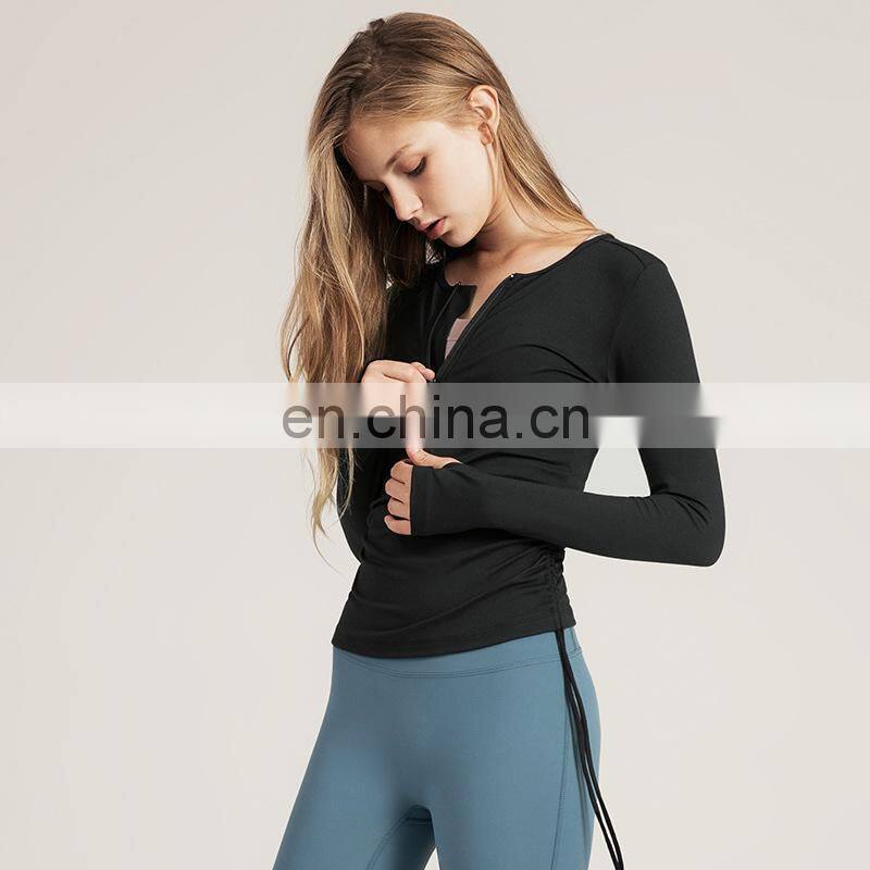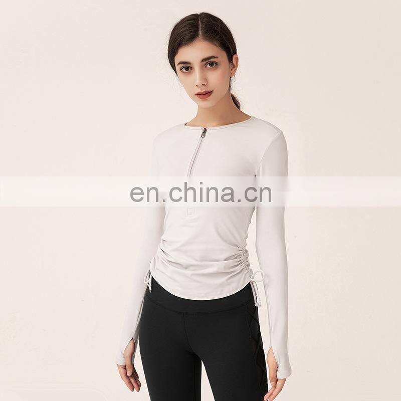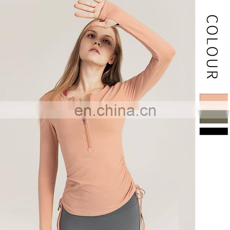 Wholesale Fitness Gym Wear Long Sleeve Tee for Women Side Draw String Yoga T-shirts Half Zipper Sexy Gym Top Ladies Sportswear